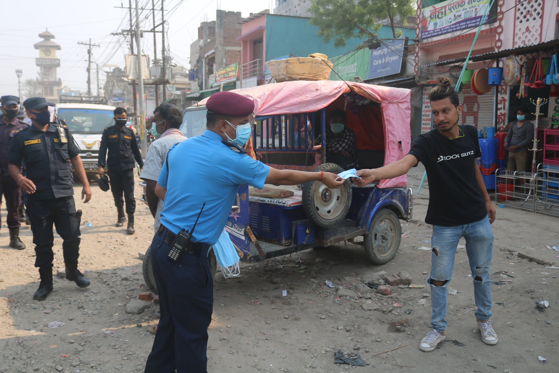 काठमाडौं । कोभिड-१९ संक्रमणको रोकथाम तथा जोखिम न्यूनीकरणका लागि नेपाल प्रहरीद्वारा संचालित तपाईंको मास्क खोई कार्यक्रम अन्तर्गत पछिल्लो २४ घण्टामा प्रहरीले १४ हजार ७ सय ३९ जनालाई निस्शुल्क मास्क वितरण गरेको छ ।