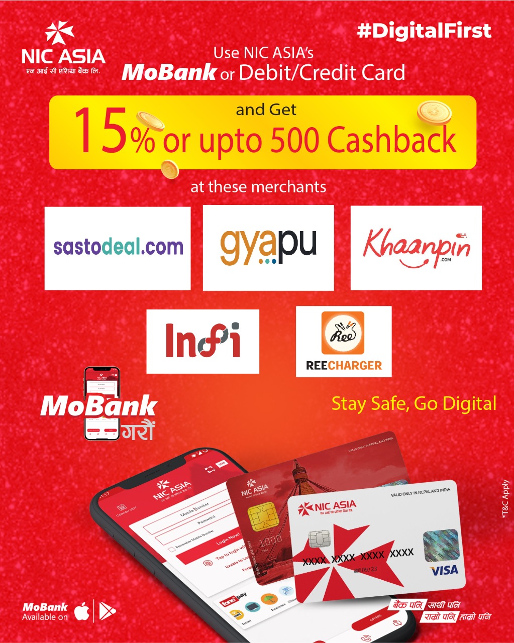 काठमाडौं । एन आई सी एशिया बैंकले आफ्ना ग्राहकहरूलाई घरमै बसेर विभिन्न अनलाईनमार्फत २०७८ वैशाख ३१ सम्म अत्यावश्यक सामाग्री खरिद गर्दा १५ प्रतिशत वा अधिकतम ५०० सम्म नगद फिर्ताको योजना सार्वजनिक गरेको छ ।