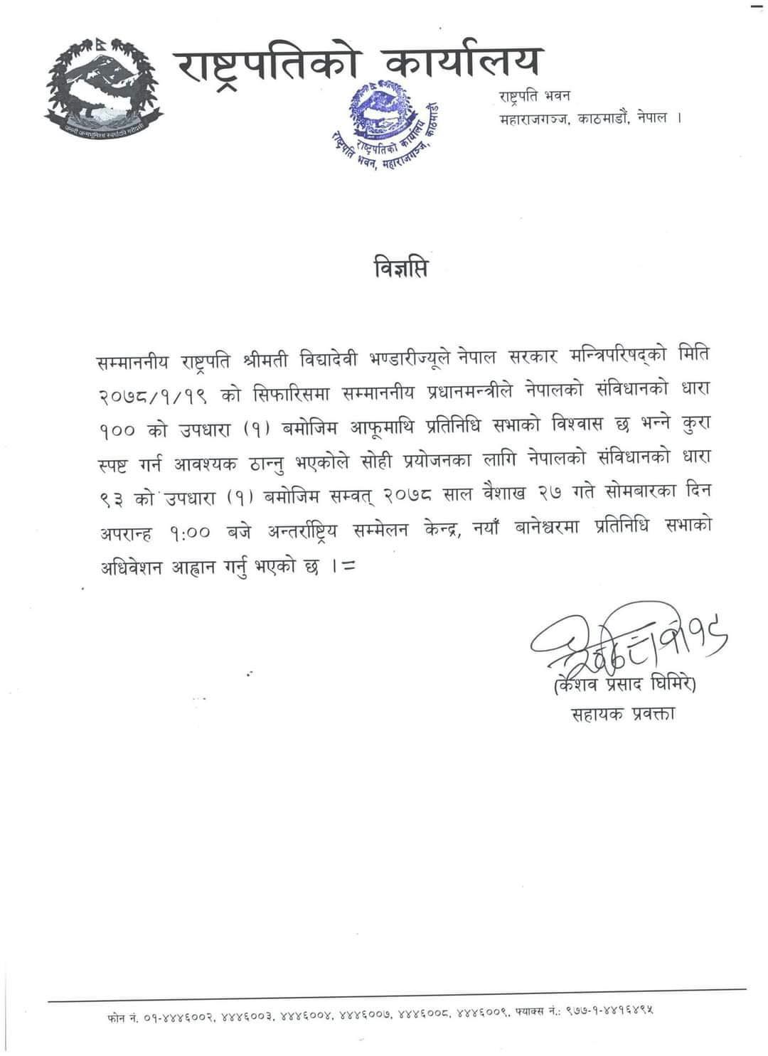 प्रधानमन्त्री केपी शर्मा ओलीले आगामी वैशाख २७ गतेका लागि संसद अधिवेशन बोलाउनका लागि सिफारिस गरेका थिए ।