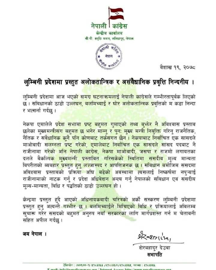 नेपाली कांग्रेसका सभापति शेरबहादुर देउवाले आइतबार साँझ एक विज्ञप्ति जारी गरी लुम्बिनी प्रदेशको समग्र घटनालाई पार्टीले गम्भिरतापूर्वक लिएको बताएका हुन् । उनले लुम्बिनी प्रदेशमा अलोकतान्त्रिक र असंवैधानिक रुपले मुख्यमन्त्री चयन गरिएको भन्दै संविधानको उल्लंघन, बलमिच्याई र अलोकतान्त्रिक प्रवृत्तिको निन्दा र भत्र्सना गरेका छन् ।