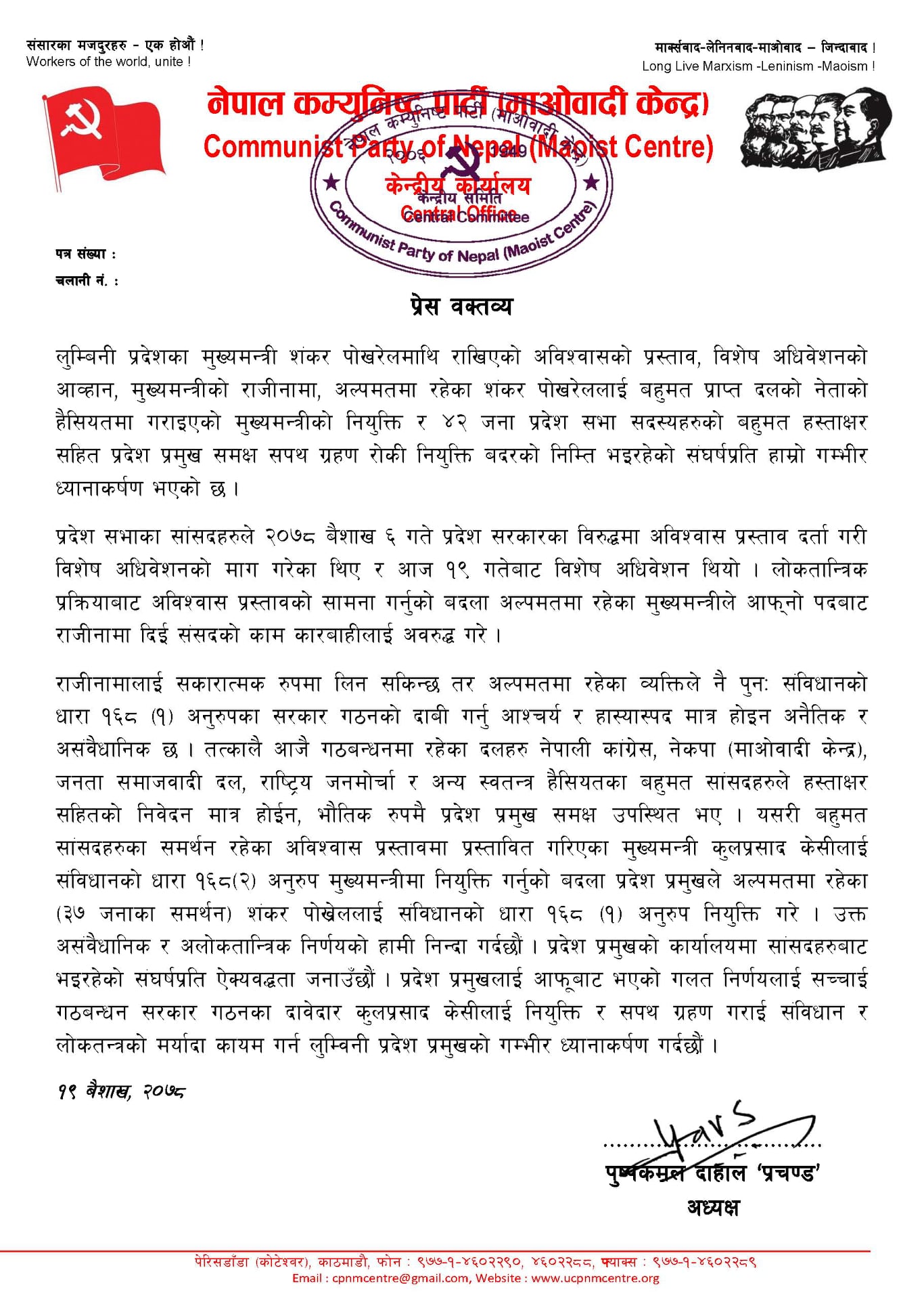शनिबार एक प्रेस वक्तव्य जारी गरि प्रचण्डले प्रदेश प्रमुखलाई आफूबाट भएको गलत निर्णयलाई सच्चाई गठबन्धन सरकार गठनका दावेदार कुलप्रसाद केसीलाई नियुक्ति र सपथ ग्रहण गराई संविधान र लोकतन्त्रको मर्यादा कायम गर्न ध्यानाकर्षण गराएका हुन् ।