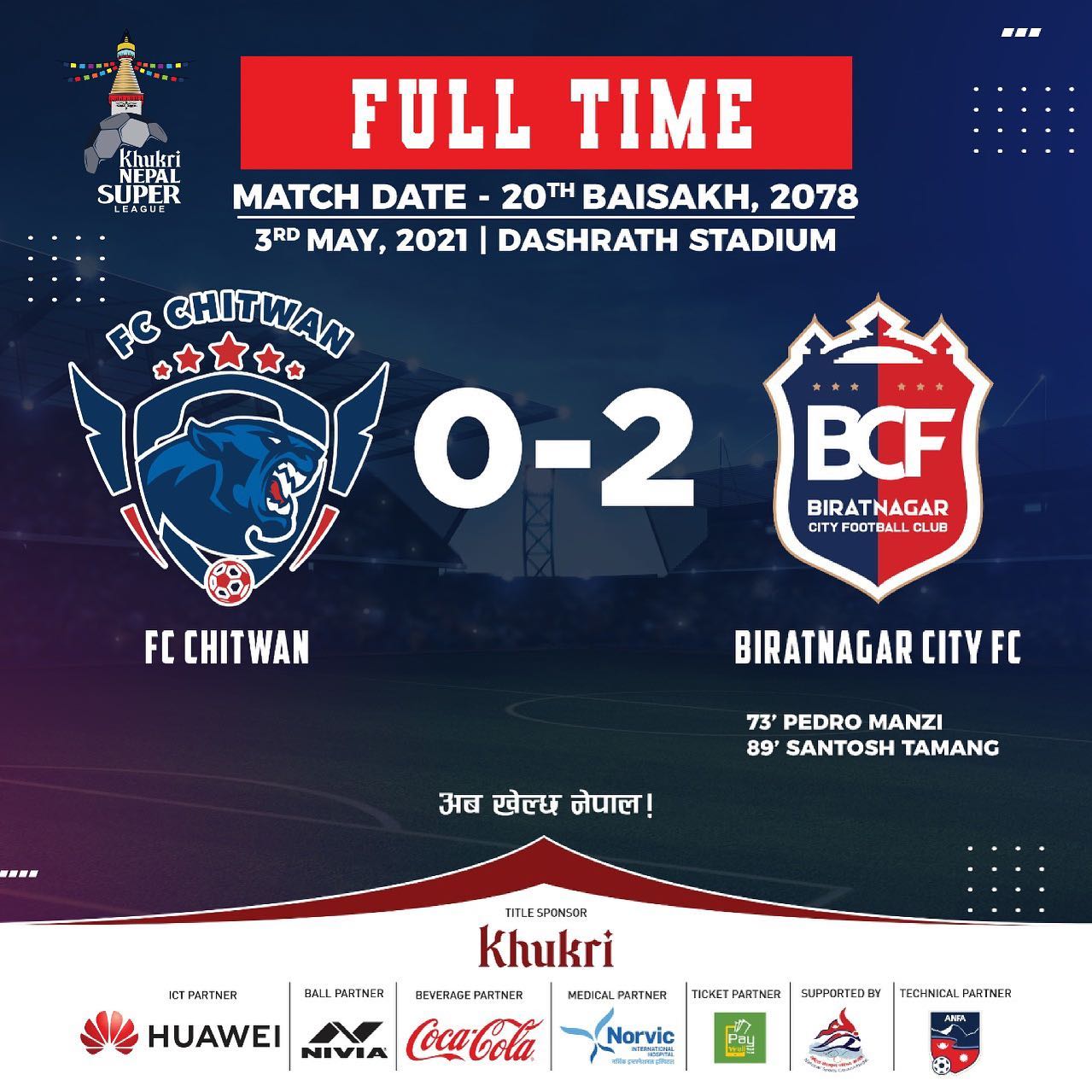 काठमाडौं। नेपाल सुपर लिग (एनएसएल) अन्तर्गत एफसी चितवन र विराटनगर सिटी एफसी बिचको खेलमा विराटनगरले २-० को जित निकालेको छ। खेलको दोस्रो हाफमा उप-कप्तान पेड्रो मञ्जी र सन्तोष तामाङले उत्कृष्ट गोल गर्दा चितवन स्तब्ध भएको हो।
