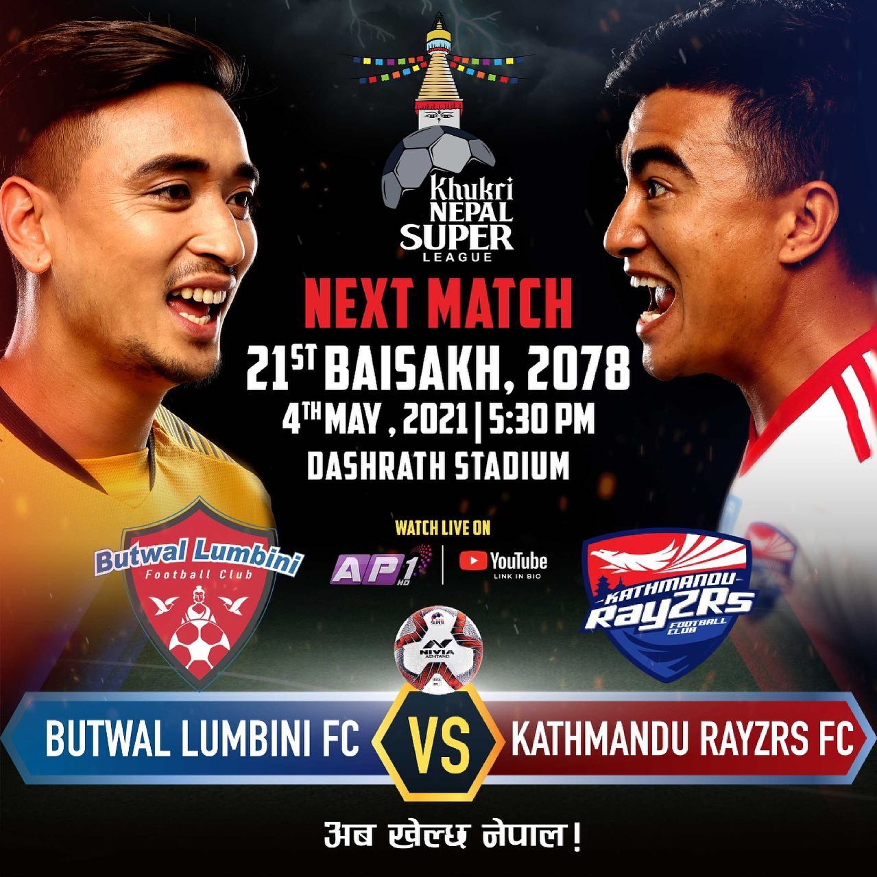 काठमाडौं ।  खुकरी नेपाल सुपर लिग (एनएसएल) मा आज एक खेल हुँदैछ। काठमाडौं रेजर्सको सामना गर्दैछ बुटवल लुम्बिनी एफसी।