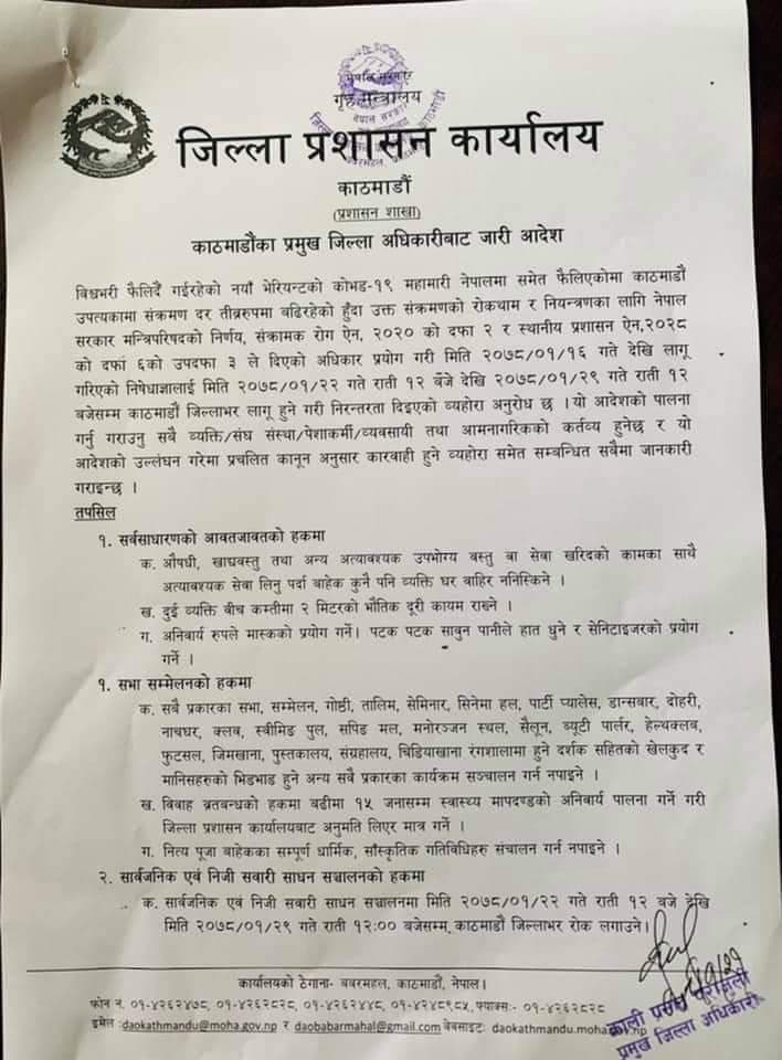 आज बसेको काठमाडौं उपत्यका तीनै जिल्लाका प्रमुख जिल्ला अधिकारीहरुले आगामी वैशाख २९ गतेसम्मका लागि निषेधाज्ञा जारी गर्ने निर्णय गरेको हो ।