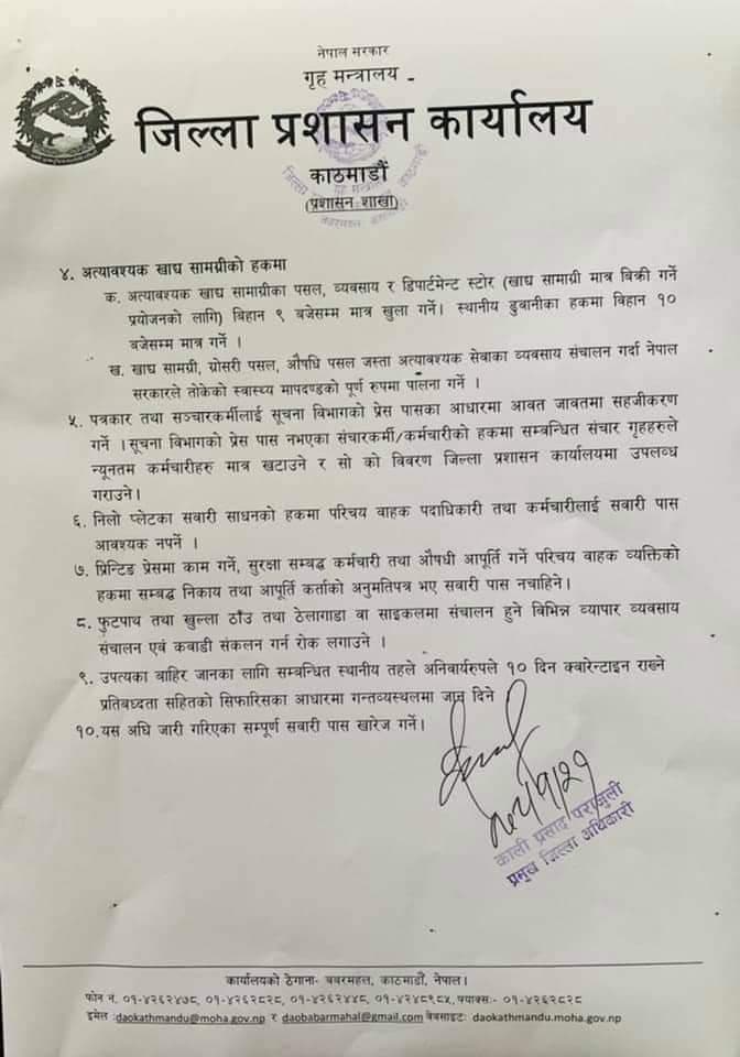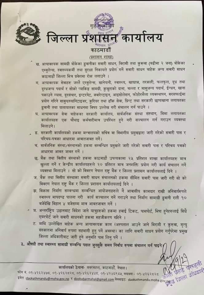 बैठकको निर्णय अनुसार औषधी, खाद्यवस्तु तथा अन्य अत्यावश्यक उपभोग्य बस्तु तथा सेवाको खरिदको कामका साथै अत्यावश्यक सेवा लिनु पर्दा बाहेक कुनै पनि व्यक्ति बाहिर ननिस्किने निर्णय भएको छ ।