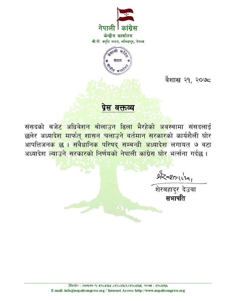 “संसदको बजेट अधिवेशन बोलाउन ढिला भैरहेको अवस्थामा संसदलाई छलेर अध्यादेशमार्फत शासन चलाउने वर्तमान सरकारको कार्यशैली घोर आपत्तिजनक छ । संवैधानिक परिषद् सम्बन्धी अध्यादेश लगायत ७ वटा अध्यादेश ल्याउने सरकारको निर्णयको नेपाली कांग्रेस घोर भत्सर्ना गर्दछ ।” जारी विज्ञप्तिमा भनिएको छ ।