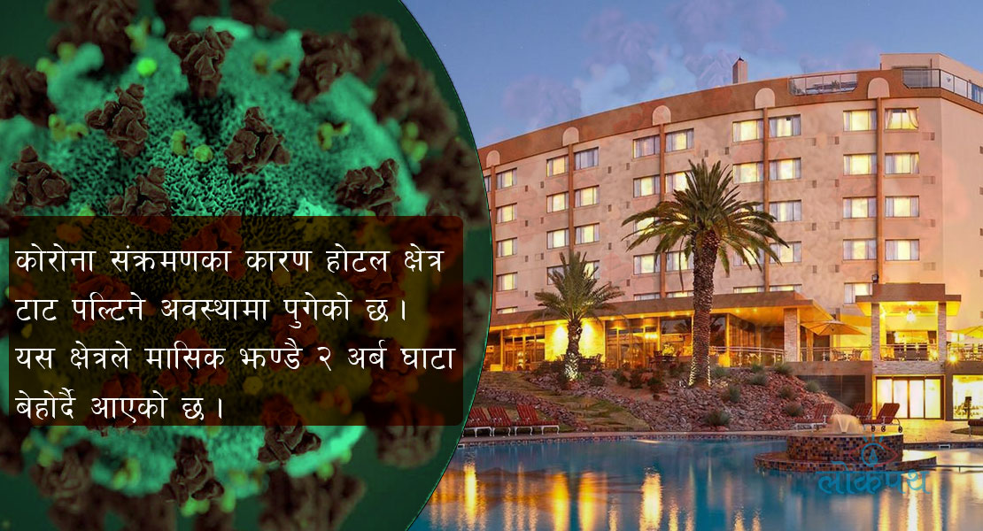 तर कोरोना संक्रमणसँगै होटल क्षेत्र पूर्ण रुपमा रुपमा टाट पल्टिए । कोरोना संक्रमणभरी कुनै पनि होटलले राम्रोसँग कारोबार गर्न नपाएको होटल संघ नेपाल(हान)ले जनाएको छ । होटल क्षेत्रले मासिक अर्वाै रुपैँया घाटा बेहोर्दै आएको छ । यस क्षेत्रले मासिक रुपमा १ अर्ब ८० करोड रुपैँया घाटा बेहोर्ने गरेको हानका महासचिव साजन शाक्यले बताए । हानमा देशैभरीका ३ हजार ५ सय होटल आवद्ध छन् । अहिले होटल पूर्ण रुपमा घाटामा भएकाले होटलका लगानीकर्ताले पनि आगामी ४/५ वर्षसम्म लाभांश पाउने अवस्था छैन । कोराना संक्रमणका कारण सबैभन्दा बढी प्रभावित क्षेत्र हो होटल क्षेत्र । गत वर्षको मौद्रिक नीतिमार्फत सरकारले होटल क्षेत्रलाई पुर्नकर्जाको व्यवस्था गरेको थियो । यहि पुर्नकर्जाका कारण होटल क्षेत्रले केही राहत महसुस गरेको महासचिव शाक्यको भनाई छ । ‘अहिले सम्म ठुला होटलहरुले २० करोड र केही साना होटलहरुले १/२ करोड रुपैँया पनि पुर्नकर्जा लिएका छन् । त्यसले केही राहत दिएको छ ।’ उनले भने । शाक्यका अनुसार हालसम्म ९३ वटा होटलहरुले पुर्नकर्जाको सुविधा लिइसकेका छन् । तर संक्रमणको अवस्था लम्बिदै गयो भने पुर्नकर्जाको सीमा बढाएर ५० करोड रुपैँया पुर्याउनुपर्ने शाक्यको माग छ । ‘यदि पुर्नकर्जाको सीमा नबढाउने हो भने आगामी पाँच वर्षमा आधा होटल बन्द हुन्छन् ।’ महासचिव शाक्यले भने ।