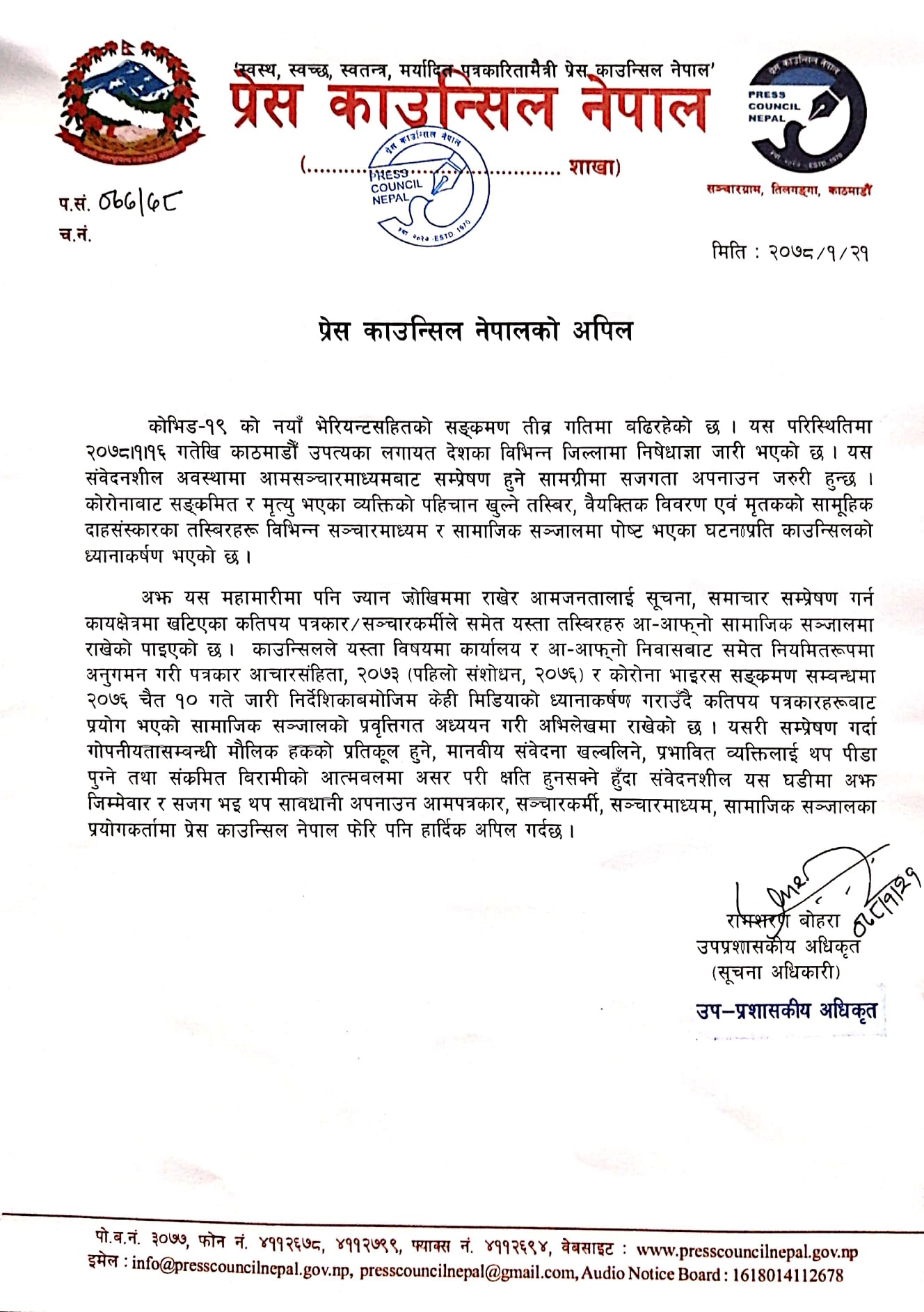 “यस सम्बेदनशील अवास्थामा आम सञ्चारमाध्यमबाट सम्प्रेषण हुने सामाग्रीमा सजगता अपनाउन जरुरी हुन्छ । कोरोनाबाट संक्रमित र मृत्यु भएका व्यक्तिको पहिचान खुल्ने तस्वीर, वैयक्तिक विवरण एवम् मृतकको सामाजिक दाहासंस्कारका तस्वीरहरु विभिन्न सञ्चारमाध्यम र सामाजिक सामाजिक सञ्जालमा पोष्ट भएका घटनाप्रति काउन्सिलको ध्यानाकर्षण भएको छ ।” जारी विज्ञप्तिमा भनिएको छ ।