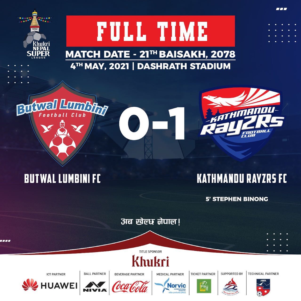 दशरथ रंगशालामा खेलिएको सो खेलको निर्णायक गोल काठमाडौंका स्टेफन विनोङले गरे।