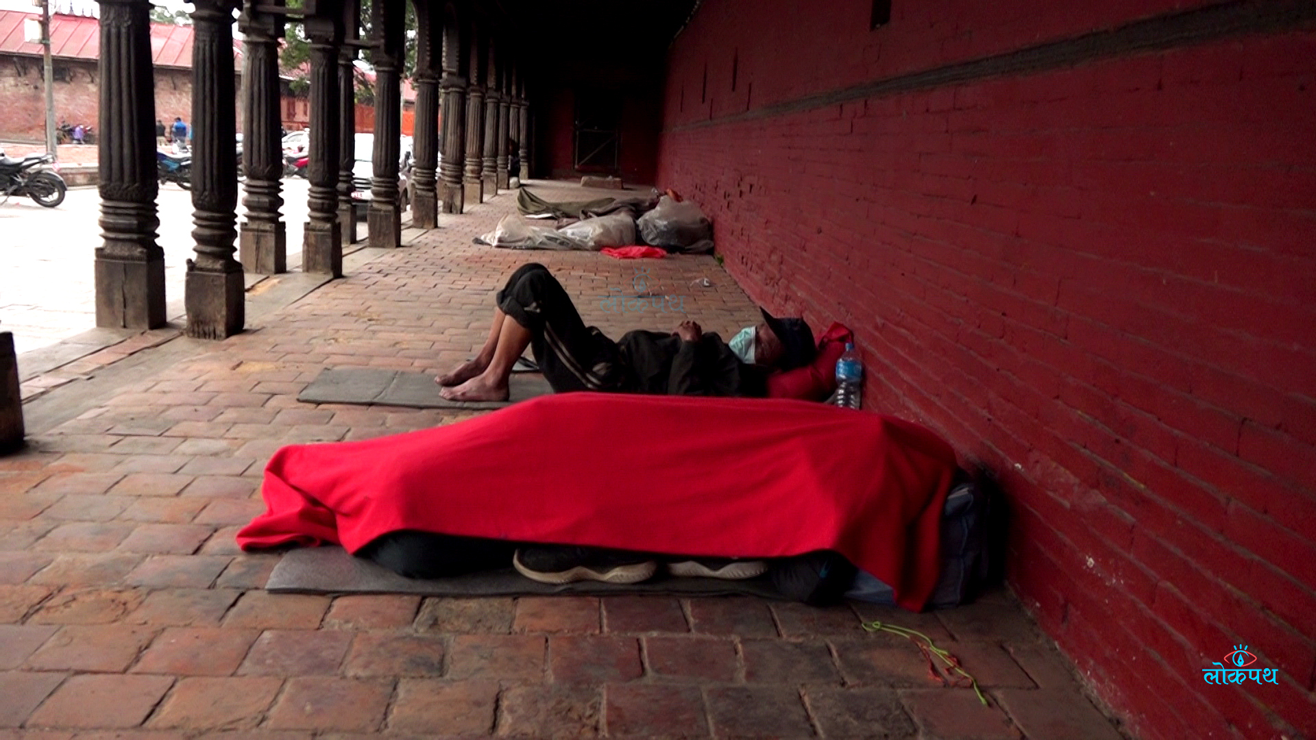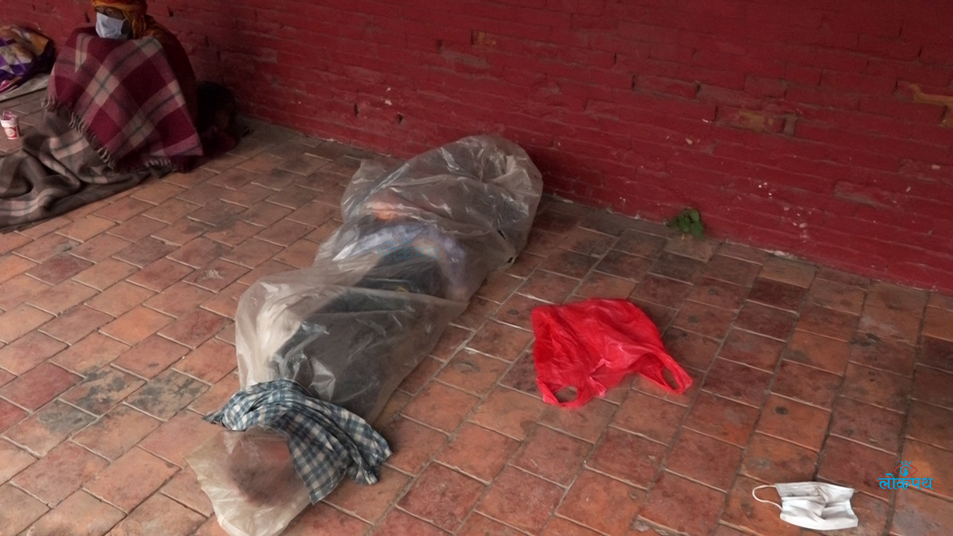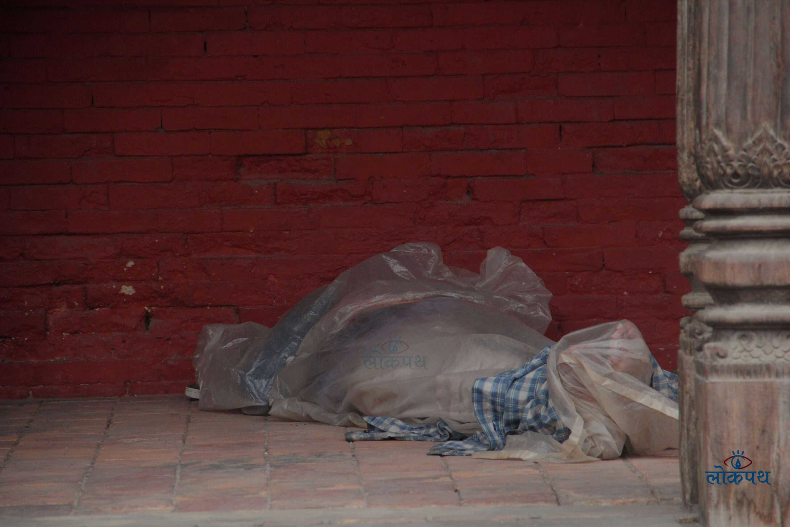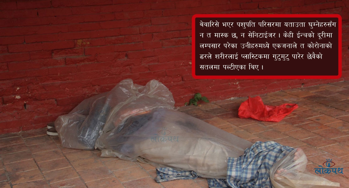 न मास्क, न सेनीटाईजर । केही ईन्चको दूरीमा लम्पसार उनीहरुमध्ये एक जनाले कोरोना जोखिम बढेको डरले प्लास्टिकले आफूलाई गुटुमुटु बेरेका रहेछन् । जिज्ञाशा राख्दा उनी बोलेनन् । नजिकै सुतेका अर्काले भने, ‘कोरोनाको डरले यो यसरी नै सुत्छ।’