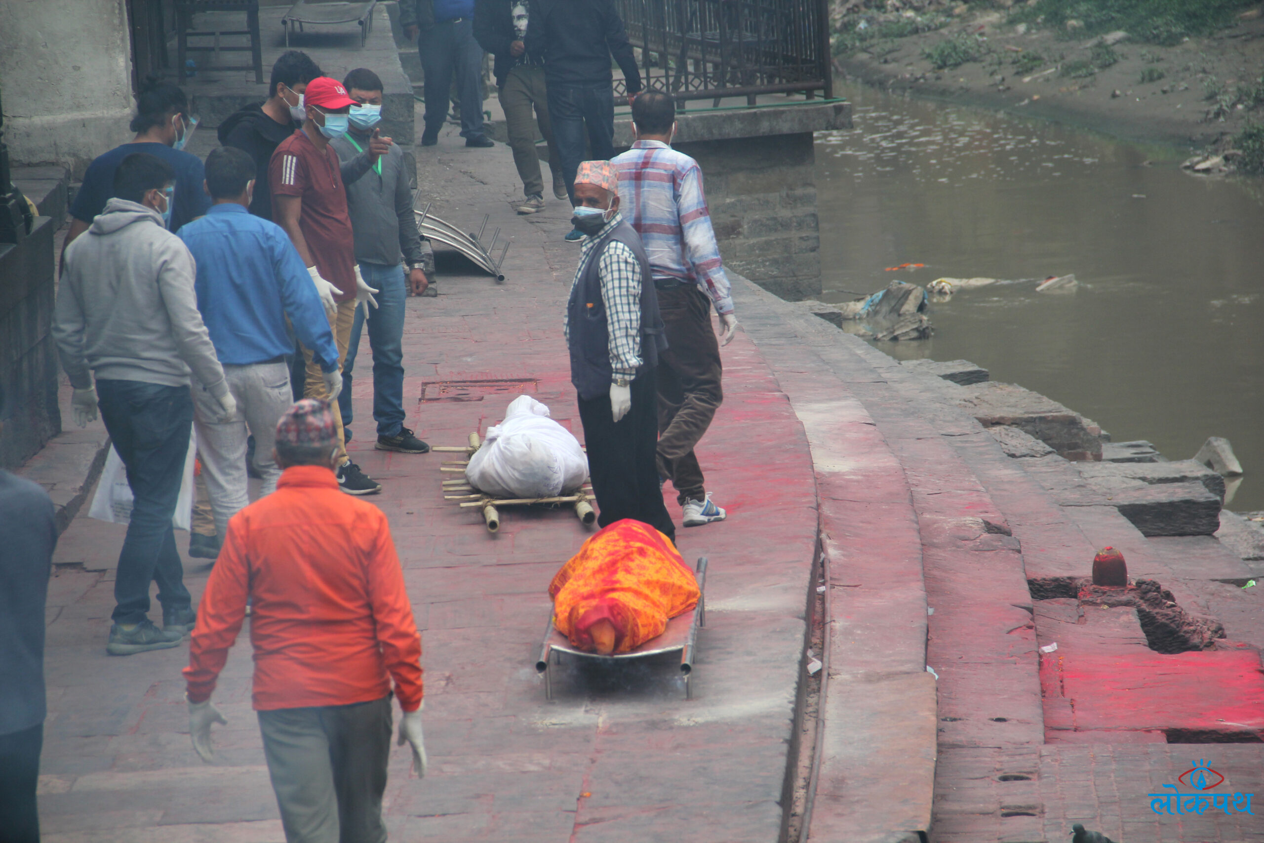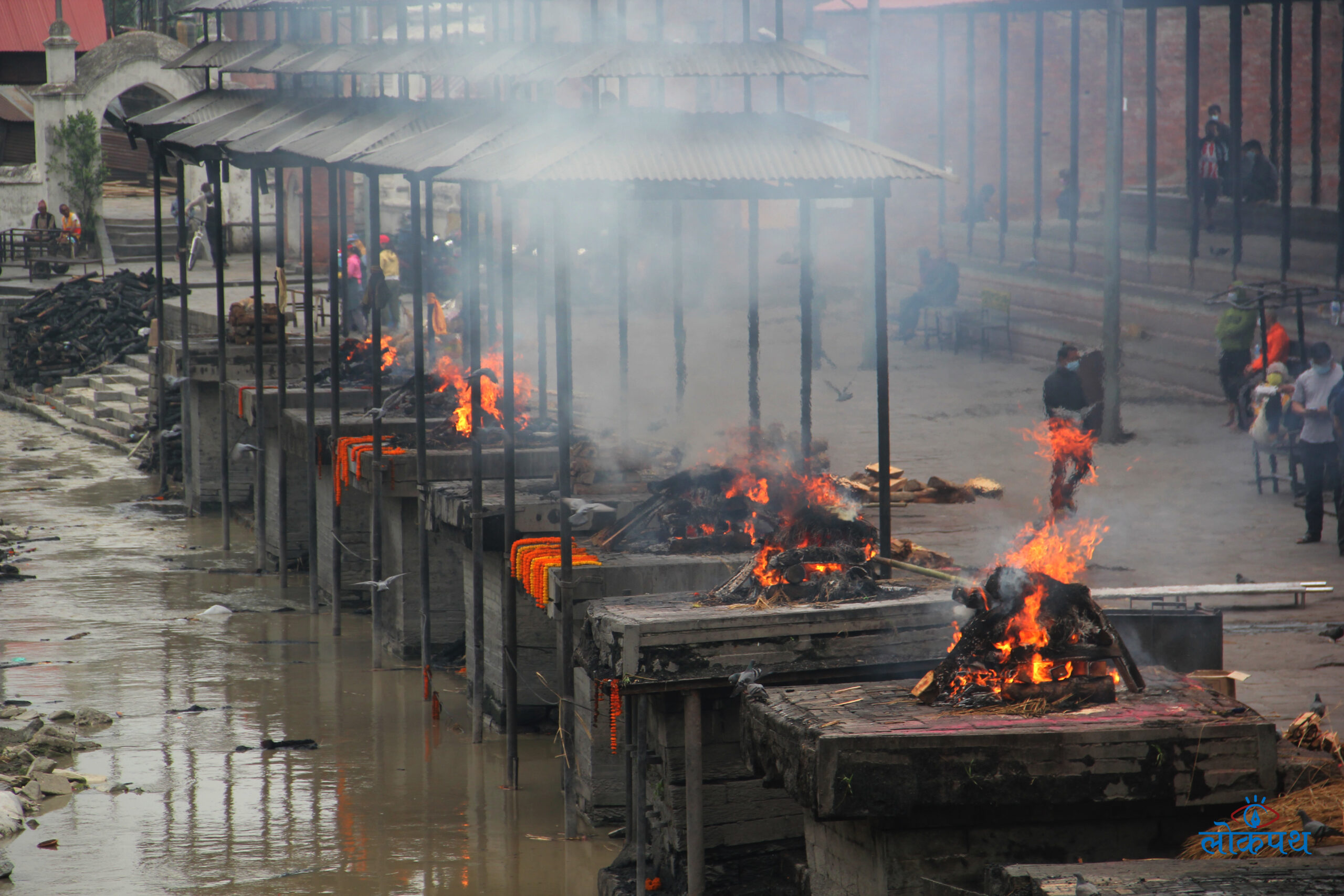 केहि दिन अघि मात्रै कोरोना संक्रमणबाट ज्यान गुमाएर अन्त्येष्टिका लागि विद्युतिय शवदाह गृहमा ल्याईएका शवहरु बाग्मतीको पल्लोपट्टी किनारामा जले ।