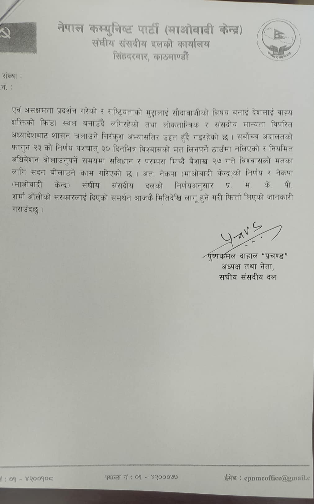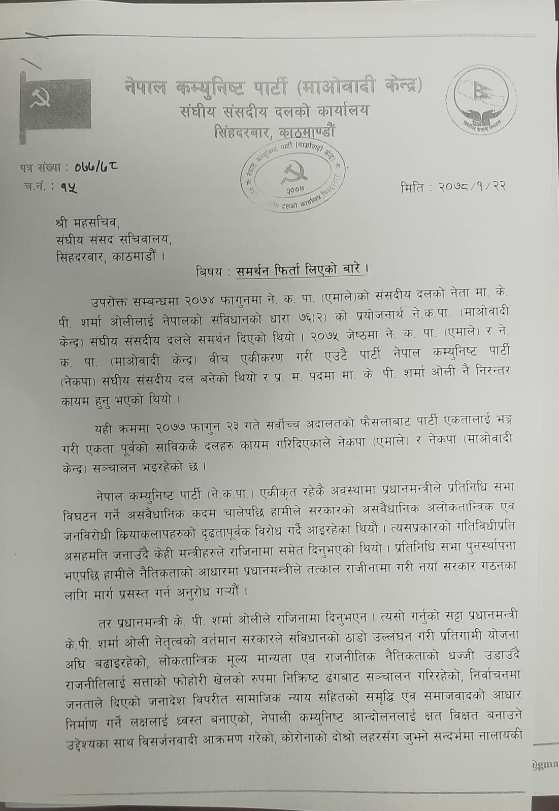 मंगलवार बसेको माओवादी केन्द्रको स्थायी कमिटी बैठकले सरकारलाई दिएको समर्थन फिर्ता लिने निर्णय गरेको र आज संघीय संसद सचिवालयमा पत्र दर्ता गराएको हो ।
