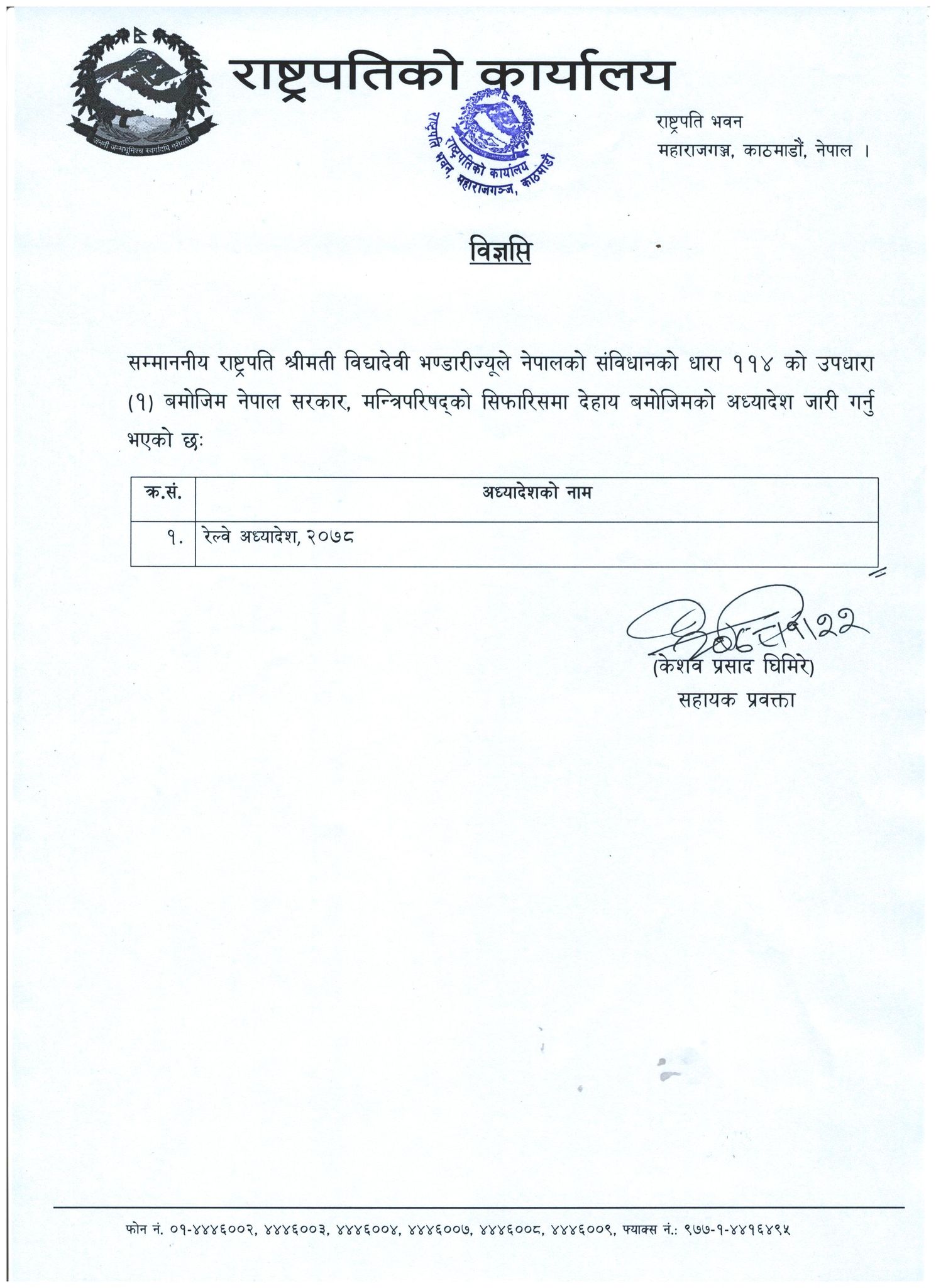 नेपालको संविधानको धारा ११४ को उपधारा १ बमोजिम अध्यादेश जारी गरेको राष्ट्रपति कार्यालयले जारी गरेको विज्ञप्तिमा उल्लेख छ ।