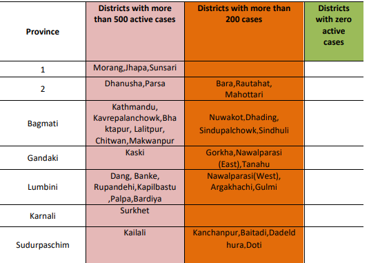 स्वास्थ्य मन्त्रालयको पछिल्लो विवरण अनुसार हाल काठमाडौं उपत्यकाका तीन वटै जिल्लाका साथै मोरङ, झापा, सुनसरी, धनुषा, पर्सा, काभ्रेपलान्चोक चितवन मकवानपुर, कास्की, दाङ, बाँके, रुपन्देही, कपिलवस्तु, पाल्पा, बर्दिया, सुरखेत र कैलाली जिल्लामा ५०० भन्दा बढी सक्रिय संक्रमित रहेका छन् ।