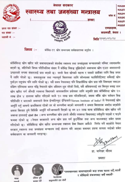 नेपाल कोरोना महामारीमा लढिरहेको र यस सन्दर्भमा तत्काल नेपालले ५० लाख मात्रा कोभिडशिल्ड खोप खरिद गर्न नसक्ने मन्त्रालयले जनाएको छ ।