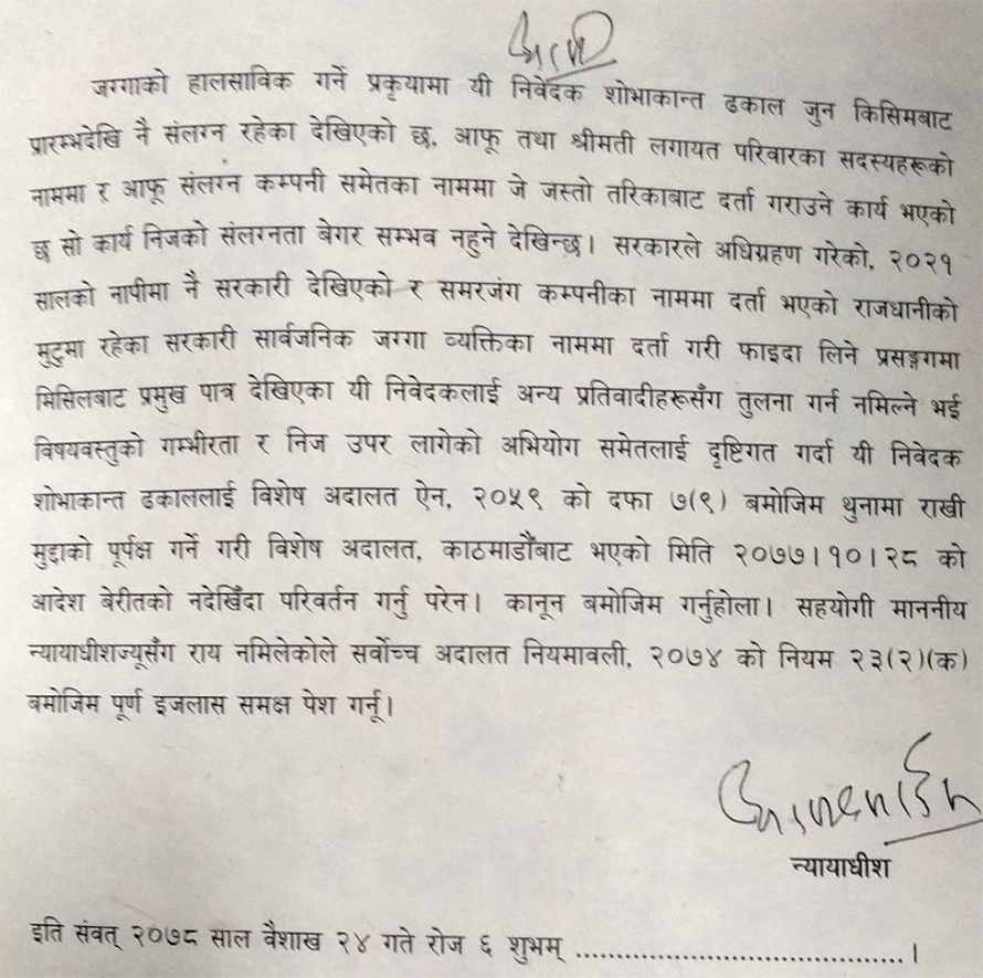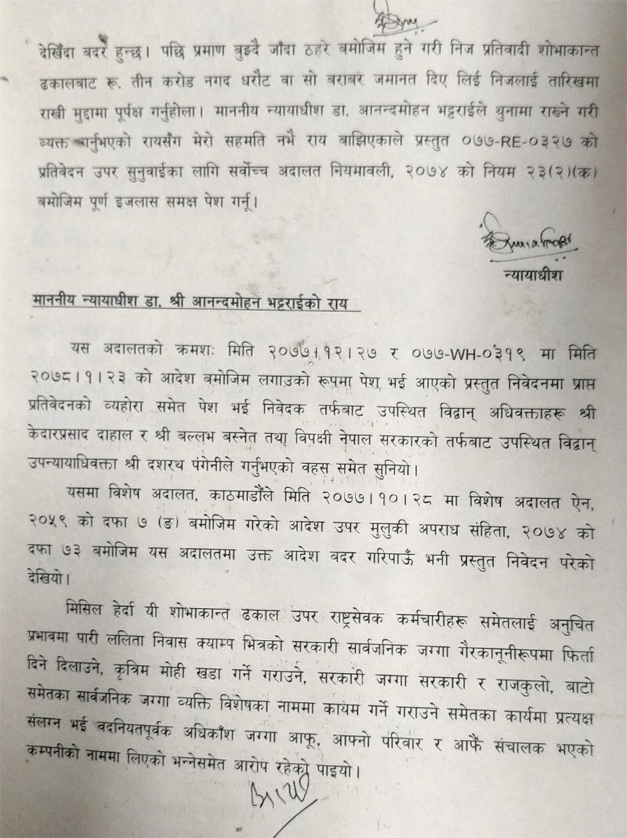 काठमाडौं । बालुवाटारस्थित ललिता निवास जग्गा प्रकरणमा मुख्य अभियुक्त शोभाकान्त ढकालको रिहाइको सन्दर्भमा न्यायाधीशहरुबीच राय बाझिएको छ ।