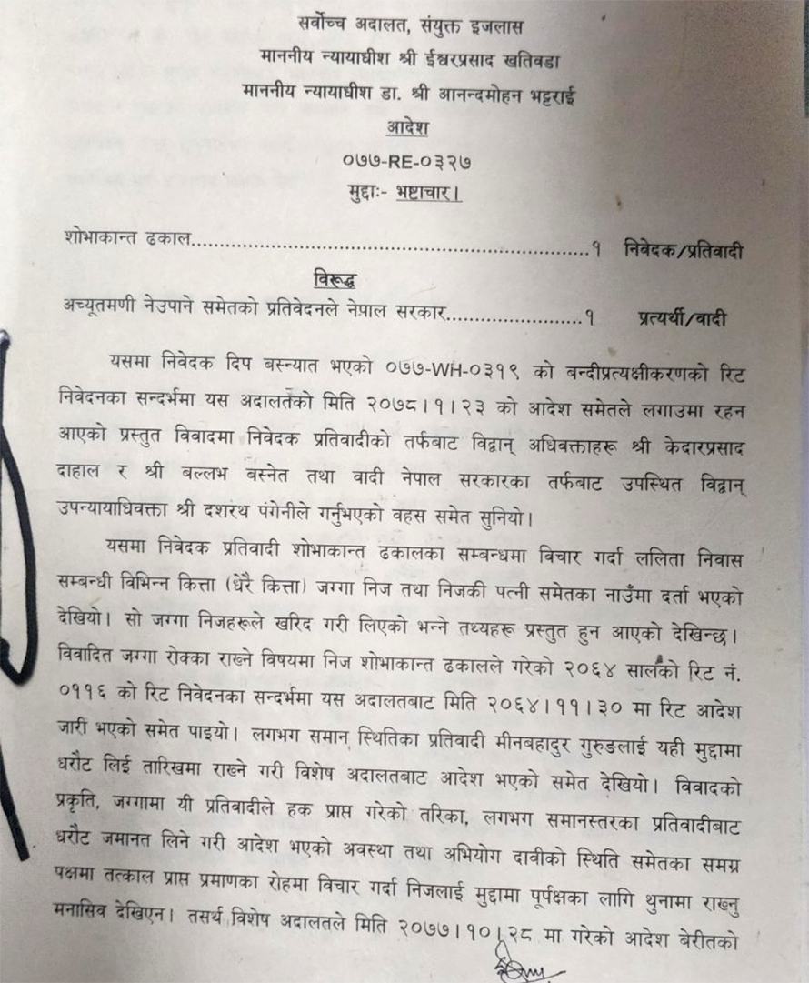 शुक्रवार सर्वोच्चका न्यायाधीशद्वय ईश्वरप्रसाद खतिवडा र डा. आनन्दमोहन भट्टराईको इजलासमा सुनुवाई भएको थियो ।