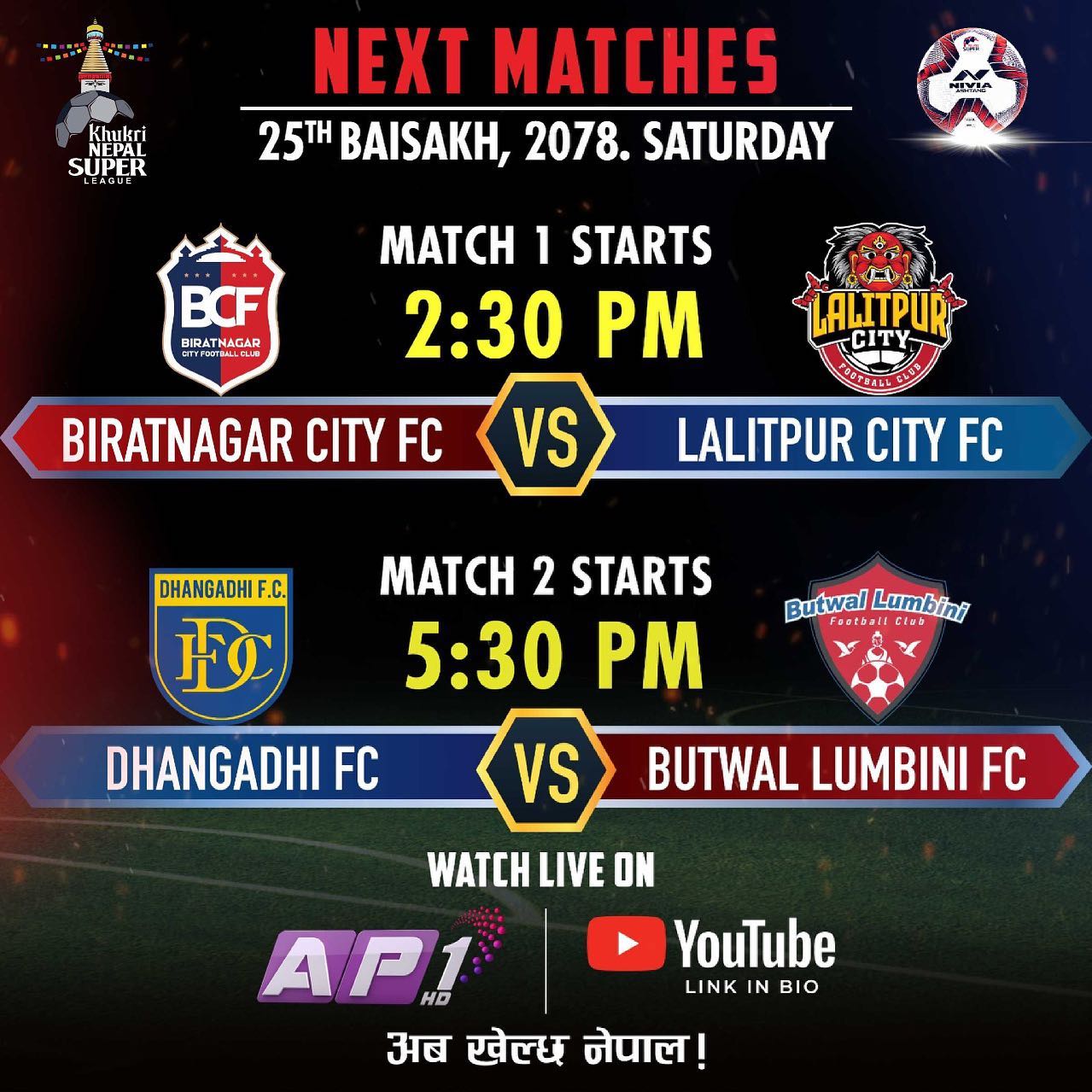 त्यस्तै आज हुने दोस्रो खेलमा अन्तिम ४ पुगिसकेको धनगढी एफसीलाई हराउँदै बुटवल लुम्बिनी एफसी आफ्नो प्लेअफ सम्भावना कायम राख्न चाहन्छ। ५ खेलमा ५ अंक रहेको बुटवलको टोली अहिले छैटौं स्थानमा रहेको अवस्था छ।