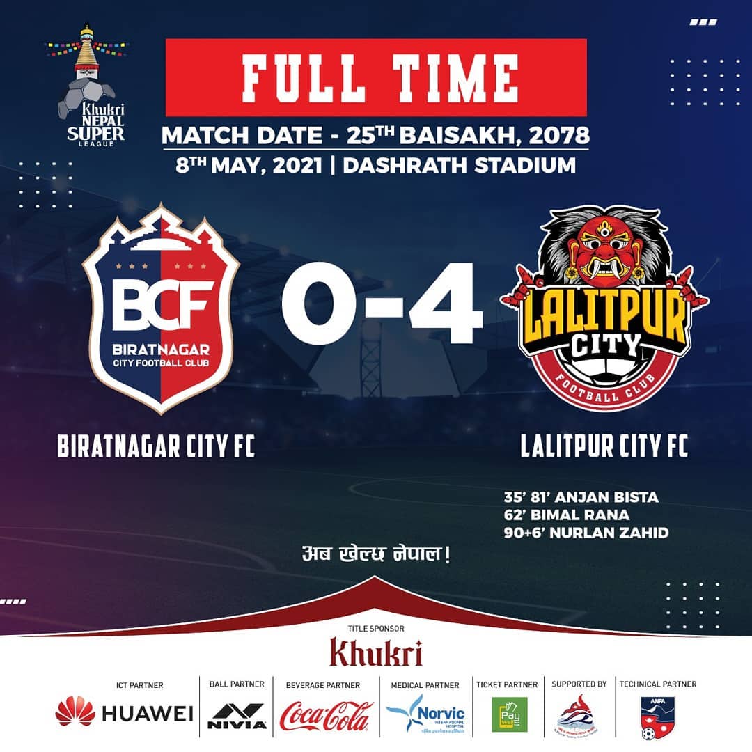 काठमाडौं।  नेपाल सुपर लिग एनएसएल अन्तर्गत आज शनिवार खेलिएको पहिलो खेलमा ललितपुर सिटी एफसीले विराटनगर सिटी एफसीलाई ४-० गोलले पराजित गरेको छ। यस जितसँगै ललितपुरले अन्तिम चारमा स्थान बनाउन सफल भएको छ।