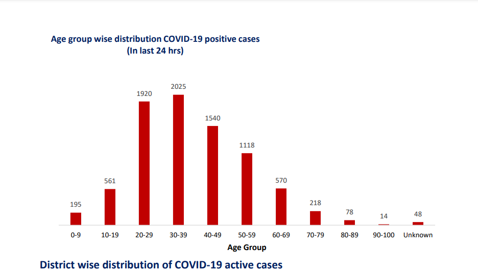 आज (शनिवार) थपिएका ८४ सय १८ जना मध्ये ३० देखी ३९ उमेर समूहका मानिसहरुमा धेरै संक्रमण पुष्टि भएको स्वास्थ्य मन्त्रमालयको तथ्याङ्क छ । ३० देखी ३९ उमेर समूहका २ हजार २५ जनामा कोरोना संक्रमण पुष्टि भएको छ । त्यस्तै २० देखी २९ उमेर समूहका मानिसहरुमा १ हजार ९ सय २० जनामा संक्रमण पुष्टि भएको छ ।