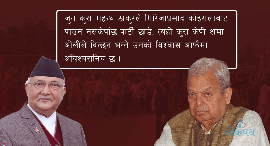 कुनैबेला कांग्रेसभित्र सभापतिको- मायामात्र होइन, सम्मान र प्रतिष्ठा पनि थियो महन्थको । तर त्यति हुँदाहुँदै पनि कांग्रेसलाई ‘जय नेपाल’ भनेर हिँड्ने बेला महन्थको गुनासो थियो, गिरिजाबाबु मधेशप्रति संवेदनशिल हुनुहुन्न । तर गिरिजाप्रसाद कोइरालाभन्दा पनि एक कदम अगाडी बढेर ओलीले मधेशले उठाएका मागप्रति संवेदनहीन टिप्पणी गर्दै आएका छन्।