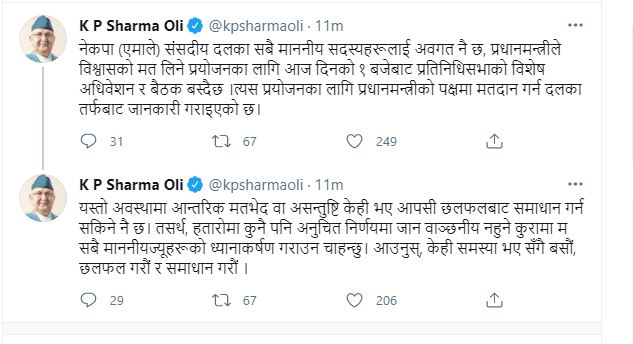 ओलीले भनेका छन्,नेकपा (एमाले) संसदीय दलका सबै माननीय सदस्यहरूलाई अवगत नै छ, प्रधानमन्त्रीले विश्वासको मत लिने प्रयोजनका लागि आज दिनको १ बजेबाट प्रतिनिधिसभाको विशेष अधिवेशन र बैठक बस्दैछ ।त्यस प्रयोजनका लागि प्रधानमन्त्रीको पक्षमा मतदान गर्न दलका तर्फबाट जानकारी गराइएको छ।’