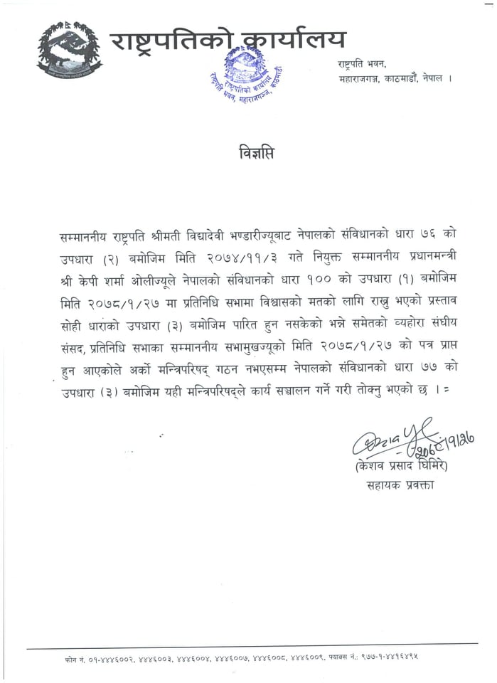 सोमबार राष्ट्रपति कार्यालयका सहायक प्रवक्ता केशव प्रसाद घिमिरेले विज्ञप्ति जारी गरी अर्को मन्त्रिपरिषद् गठन नभएसम्म नेपालको संविधानको धारा ७७ को उपधारा (३) बमोजिम वर्तमान मन्त्रिपरिषद्ले नै कार्य सञ्चालन गर्ने गरी राष्ट्रपतिले तोकेको जनाएका हुन् ।