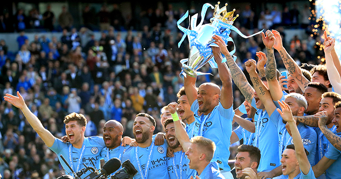 File photo dated 12-05-2019 of Manchester City’s Vincent Kompany (centre) celebrates with the trophy after the Premier League match at the AMEX Stadium, Brighton.