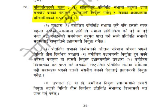 राष्ट्रपति भण्डारीले सोमवार नै एक विज्ञप्ति जारी गर्दै संविधानको धारा ७६ (२) बमोजिम संसदमा प्रतिनिधित्व गर्ने दुई वा दुई भन्दा बढी दलहरुको समर्थनमा सरकार गठन गर्न आह्वान गरेकी थिइन् । आज राती ९ बजेसम्म संसदमा प्रतिनिधित्व गर्ने कम्तिमा १३६ सांसदहरुको समर्थनसहित प्रधानमन्त्रीको नाम राष्ट्रपति समक्ष पुर्याउनुपर्नेछ । राष्ट्रपतिको आह्वान अनुसार नयाँ सरकार गठनमा कांग्रेस, माओवादी केन्द्र र जसपाका नेताद्वय उपेन्द्र यादव र डा. बाबुराम भट्टराई लागेका छन् । तर जसपाको ठाकुर र महतो पक्ष सरकारमा सामेल नहुने भएपछि बहुमतको लागि संख्या नपुग्ने देखिन्छ ।