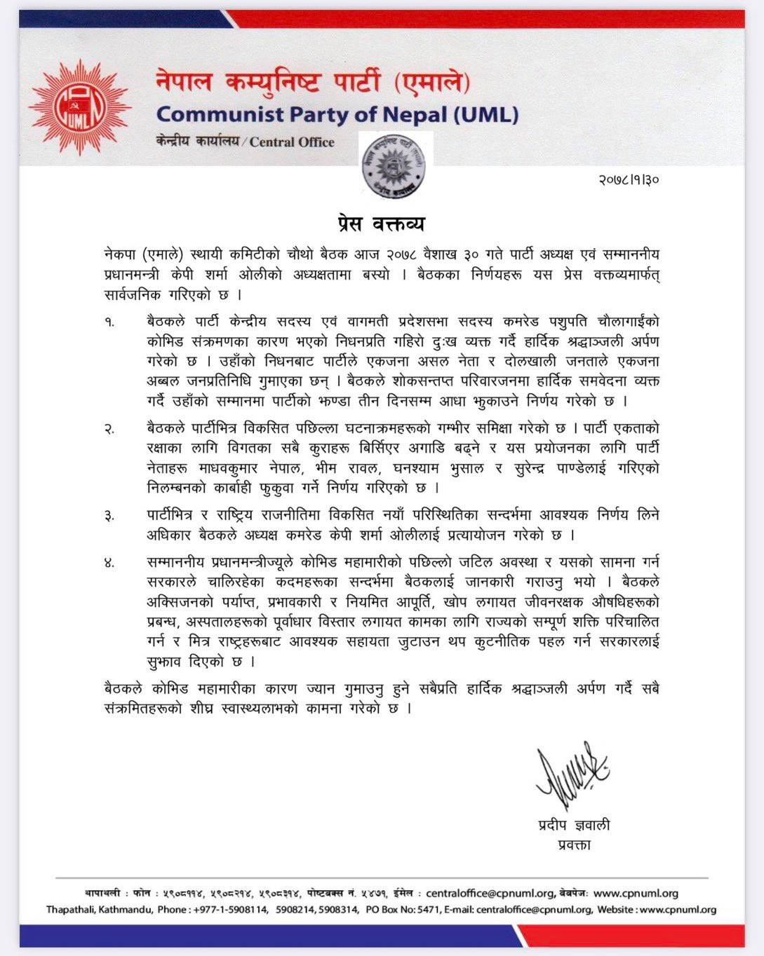 प्रधानमन्त्री निवास बालुवाटारमा बसेको बैठकले पार्टी केन्द्रीय सदस्य एवम् बागमती प्रदेश सभा सदस्य पशुपति चौलागाईको निधनप्रति दुख व्यक्त गर्दै तीन दिन पार्टीको झण्डा झुकाउने निर्णय गरेको छ ।