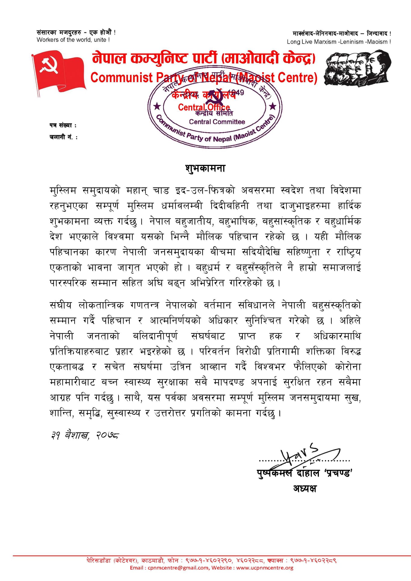 शुक्रबार बिहान मुस्लिम समुदायको चाड इद–उल–फित्रको अवसरमा शुभकामना दिदैँ अध्यक्ष प्रचण्डले जनताको बलिदानीपूर्ण संघर्षबाट प्राप्त हक र अधिकारमाथि प्रहार भईरहेको भन्दै परिवर्तन विरोधी प्रतिगामी शक्तिका विरुद्ध एकताबद्ध र सचेत संघर्षमा उत्रिन आव्हान गरेका हुन् । उनले कोरोना महामारीबाट बच्न स्वास्थ्य सुरक्षाका सबै मापदण्ड अपनाई सुरक्षित रहन समेत सबैमा आग्रह पनि गरेका छन् ।