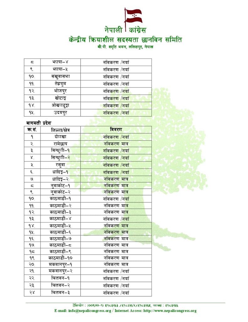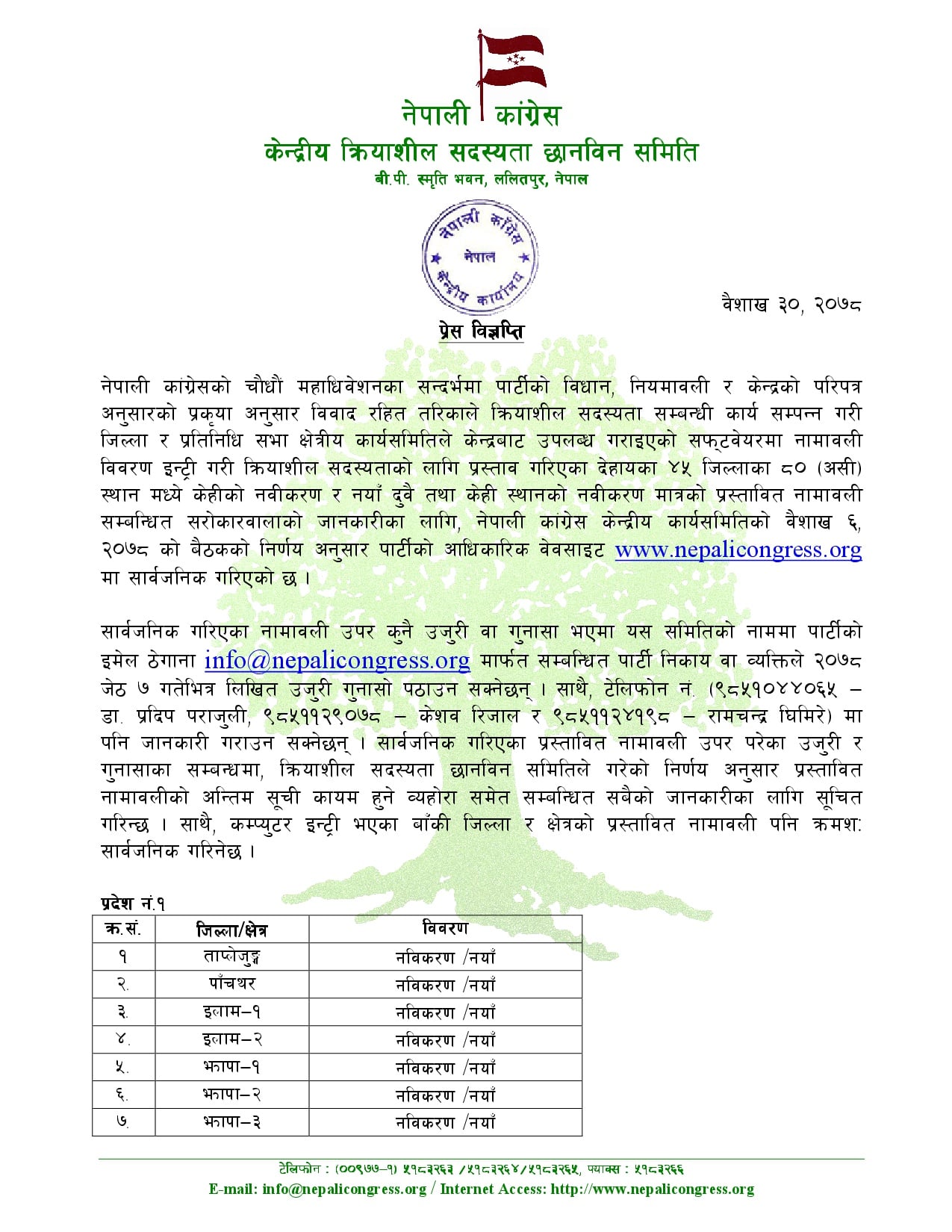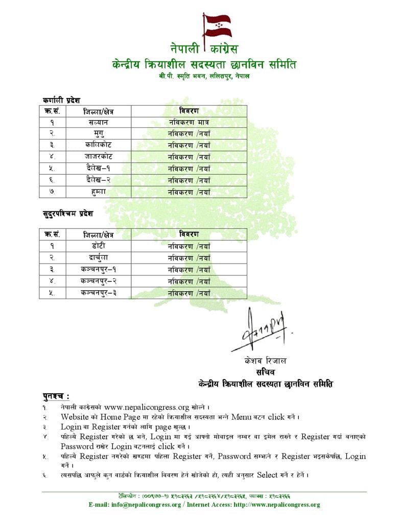 कांग्रेसले विभिन्न जिल्ला र प्रतिनिधि सभा क्षेत्रीय कार्यसमितिले केन्द्रबाट उपलब्ध गराइएको सफ्टवेयरमा नामावली विवरण इन्ट्री गरी क्रियाशील सदस्यताको लागि प्रस्ताव गरिएका देहायका ४५ जिल्लाका ८० (असी) स्थान मध्ये केहीको नवीकरण र नयाँ दुवै तथा केही स्थानको नवीकरण तर्फको प्रस्तावित नामावली सम्बन्धित सरोकारवालाको जानकारीका लागि सार्वजनिक गरेको जनाएको छ ।
