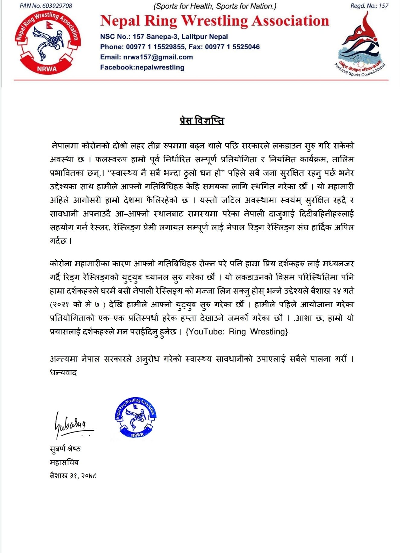 देशमा कोरोना महामारीको आक्रान्त मच्चिएको कारणले गर्दा ‘नेपाल रिङ रेस्लिङ संघ’ले रेस्लिङ खेलको सम्पूर्ण गतिविधि स्थगित गर्ने जानकारी दिएको हो। एक विज्ञप्ति निकाल्दै संघले सो जानकारी सार्वजनिक गरेको हो।