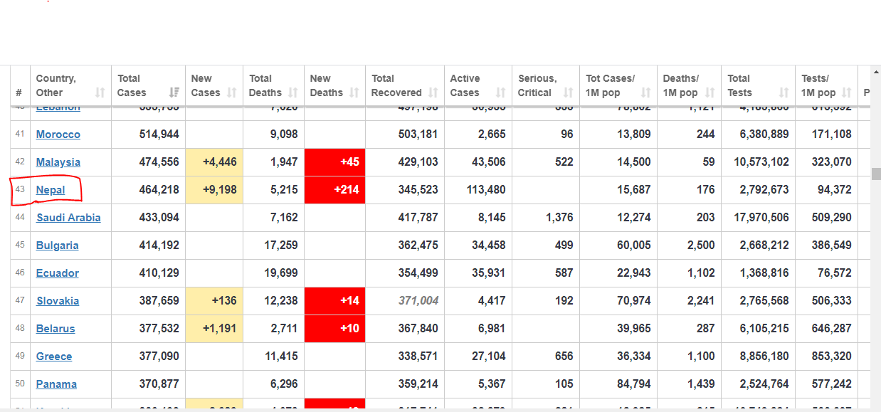 नेपाल कोरोना संक्रमितको हिसावले विश्वको ४३ औँ स्थानमा रहेको छ । अमेरिका हाल कोरोनाबाट सबै भन्दा प्रभावित देश हो । दोस्रो नम्बरमा छिमेकी मुलुक भारत रहेको छ । त्यस्तै ब्राजिल, फ्रान्स तेस्रो र चौथो स्थानमा रहेका छन् ।