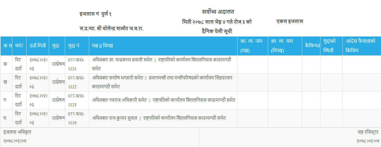 प्रधानमन्त्री ओलीविरुद्ध परेका छ्ट्टाछुट्टै ४ वटा रिटमा आज प्रधानन्यायाधीश राणाको इजलासबाट सुनुवाई हुन लागेको हो ।