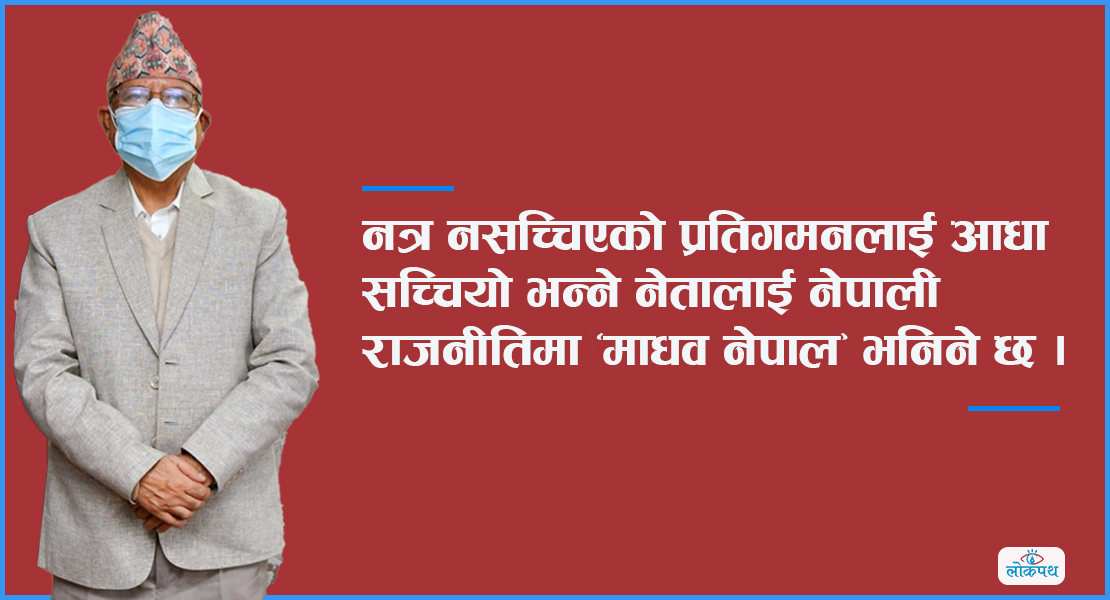विगतमा जस्तै आफ्नो दोषको भारी अरु कसैको टाउकोमा बिसाउन पाउने छुट यी ६९ बर्षिय पाका नेतालाई हुने छैन। नत्र नसच्चिएको प्रतिगमनलाई आधा सच्चियो भन्ने नेतालाई नेपाली राजनीतिमा ‘माधव नेपाल’ भनिने छ।
