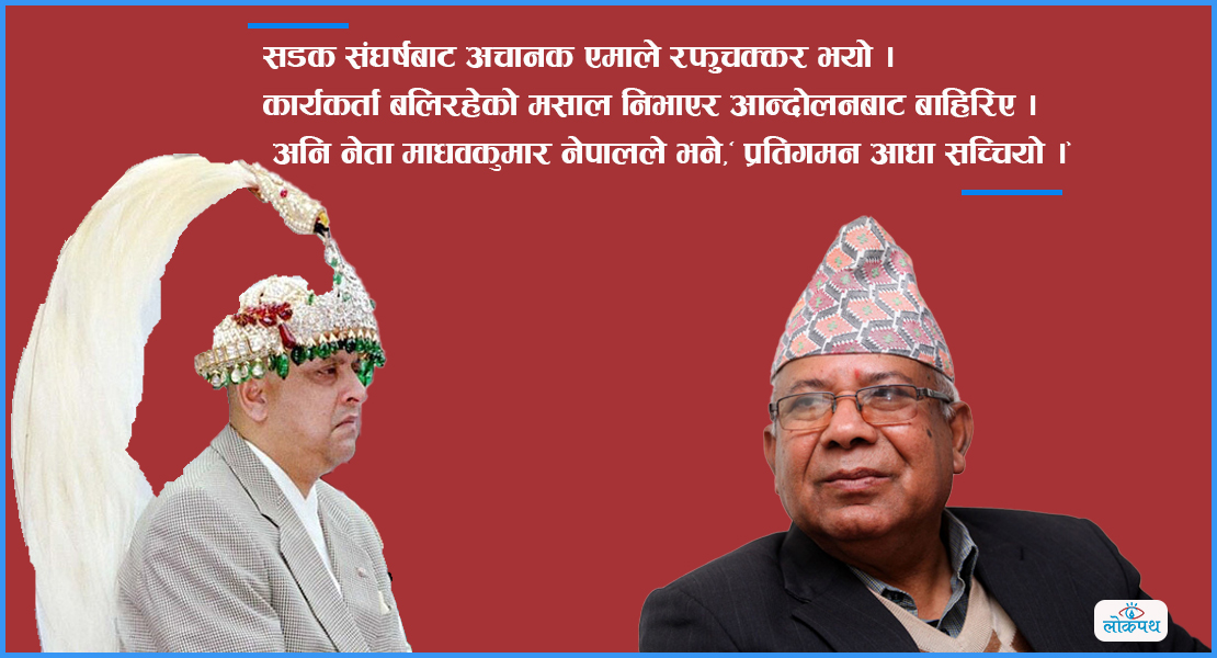 १७ वर्ष काफी हुन्छ, एउटा राजनीतिक व्यक्तिलाई बुझ्न। एमाले महासचिव थिए, माधव कुमार नेपाल । राजा ज्ञानेन्द्र शाहविरुद्ध पाँच दल कांग्रेस, एमाले, जनमोर्चा, नेमकिपा र सद्भावना सडकमा संयुक्त आन्दोलन चलाइरहेको थिए। आन्दोलन आफ्नै चालमा थियो । त्यसलाई पाँच दलले राजाको प्रतिगमन विरुद्धको आन्दोलन नाम दिएको थियो। त्यो दिन थियो, जेठ २०। वर्ष २०६१। महासचिव नेपालको आदेशमा सडक संघर्षबाट अचानक एमाले रफुचक्कर भयो । उसका कार्यकर्ता बलिरहेको मसाल निभाएर आन्दोलनबाट बाहिरिए । अनि नेपालले भने,‘ प्रतिगमन आधा सच्चियो ।’