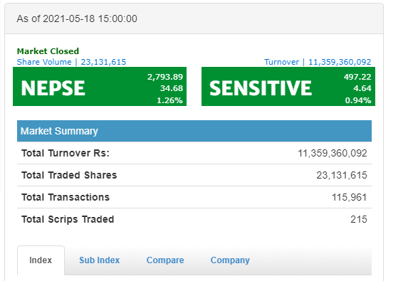 अहिलेसम्मकै उच्च अंकले वृद्धि भएको शेयर बजारमा नेप्से परिसुचक ३४ दशमलव ६८ अंकले वृद्धि भई २ हजार ७ सय ९३ दशमलव ८९ बिन्दुमा पुगेको छ ।