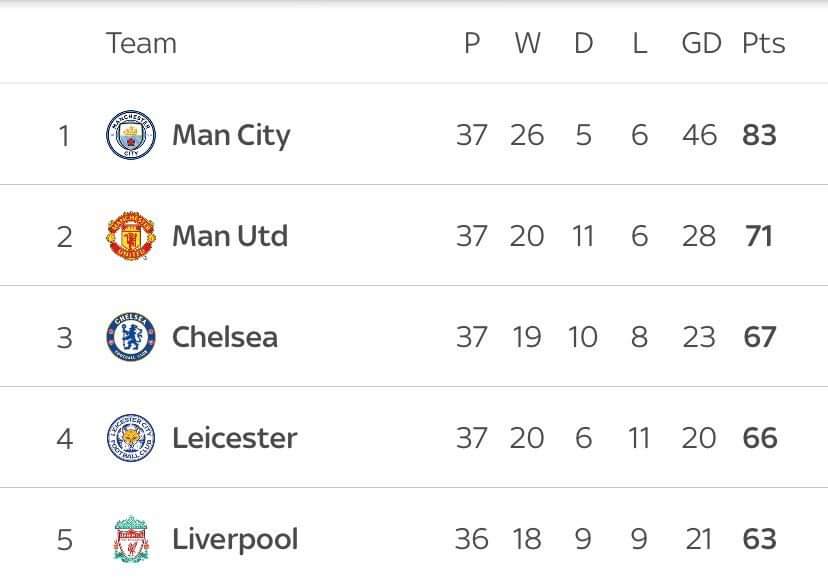 ३६ खेलमा ६३ अंकसहित लिभरपुल अंक तालिकाको पाँचौं स्थानमा रहेको छ। त्यस्तै ३७ खेलमा ६७ र ६६ अंकसहित लेस्टर र चेल्सी क्रमशः तेस्रो र चौथौ स्थानमा रहेका छन्। लिभरपुलले आजको खेलमा जित निकालेको खण्डमा लेस्टरसँग अंक बराबरी गर्नेछ भने ‘गोल डिफरेन्स’को आधारमा चौथौं स्थानमा पनि उक्लिने छ।