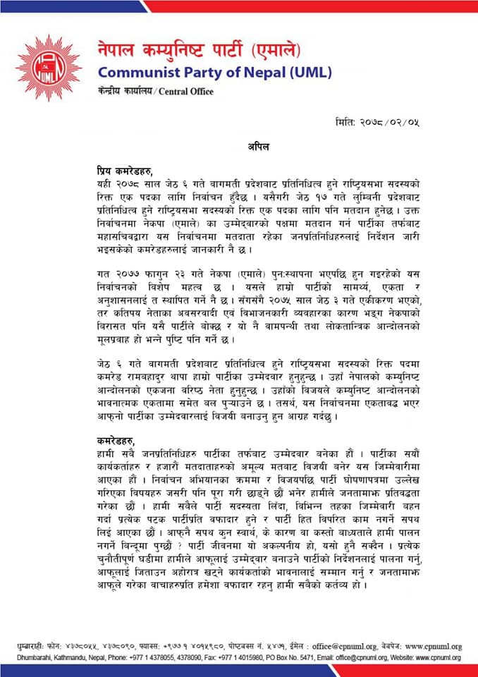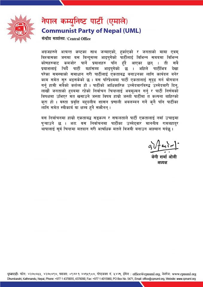 ‘जेठ ६ गते बागमती प्रदेशबाट प्रतिनिधित्व हुने राष्ट्रिय सभा सदस्यको रिक्त पदमा कमरेड रामबहादुर थापा हाम्रो पार्टीका उम्मेद्वार हुनुहुन्छ । उहाँ नेपालको कम्युनिष्ट आन्दोलनको एकजना वरिष्ठ नेता हुनुहुन्छ । उहाँको विजयले कम्युनिष्ट आन्दोलनको भावनात्मक एकतामा समेत बल पुर्याउनेछ । तसर्थ, यस निर्वाचनमा एकतावद्ध भएर आफ्नो पार्टीका उम्मेद्वारलाई विजयी बनाउनु हुन आग्रह गर्दछु ।’ ओलीले जारी गरेको विज्ञप्तिमा भनिएको छ ।