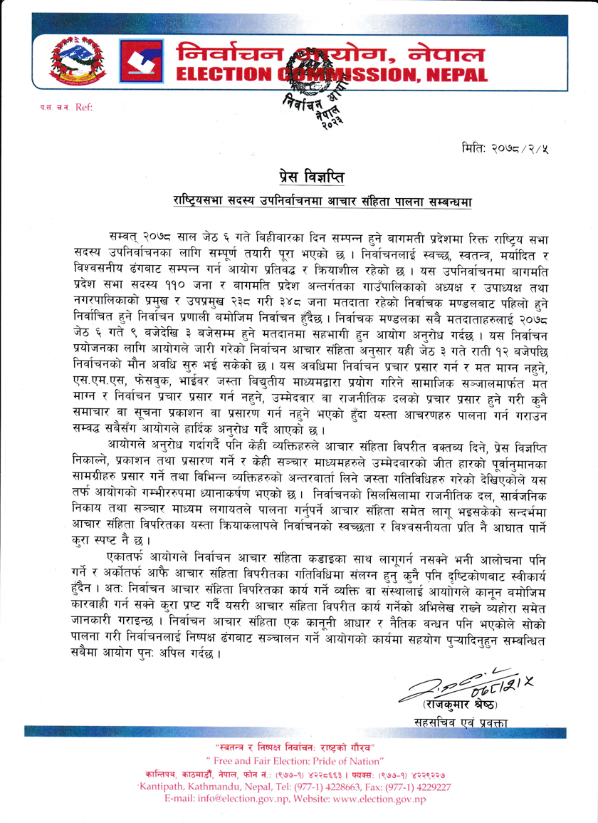 ‘आयोगले अनुरोध गर्दागर्दै पनि केहि व्यक्तिहरुले आचारसंहितले विपरित वक्तव्य दिने, प्रेस विज्ञप्ति निकाल्ने, प्रकाशन तथा प्रशारण गर्ने र केही सञ्चार माध्यमहरुले उम्मेद्वारको जीत हारको पूर्वानुमानका सामाग्रीहरु प्रसार गर्ने तथा विभिन्न व्यक्तिहरुको अन्तरवार्ता लिने जस्ता गतिविधिहरु गरेको देखिएकाले यस तर्फ आयोगको गम्भीर ध्यानाकर्षण भएको छ । निर्वाचनको सिलसिलामा राजनीतिक दल, सार्वजनिक निकाय तथा सञ्चार माध्यम लगायतले पालना गर्नुपर्ने आचारसंहिता समेत लागू भइसकेको सन्दर्भमा अचारसंहिता विपरितका यस्ता क्रियाकलापले निर्वाचनको स्वच्छता र विश्वसनीयताप्रति आघात पार्ने कुरा स्पष्टनै छ ।’ आयोगद्वारा जारी विज्ञप्तिमा भनिएको छ ।