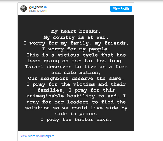 उनले ‘मेरो देश युद्धको स्थितमा छ जसले मेरो दिल टुटेको छ । मलाई मेरो परिवार साथिभाई हरुको चिन्ता लागेको छ ।’ साथै उनले इजरायललाई स्वत्रन्त्र रहने अधिकार छ भनेकी थिइन् ।