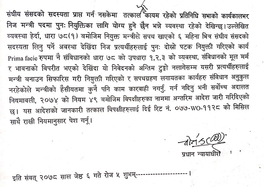 त्यसविरुद्ध परेको रिटमा सुनुवाई गर्दै आज प्रधानन्यायीश चोलेन्द्र शमशेर राणाको एकले इजलासले गृहमन्त्री रामबहादुर थापा बादलसहित संघीय संसदको सांसद नरहेका मन्त्रीहरुको नियुक्तीलाई संविधानको धारा ७८ अनुसार बदर गर्ने आदेश दिएको हो ।