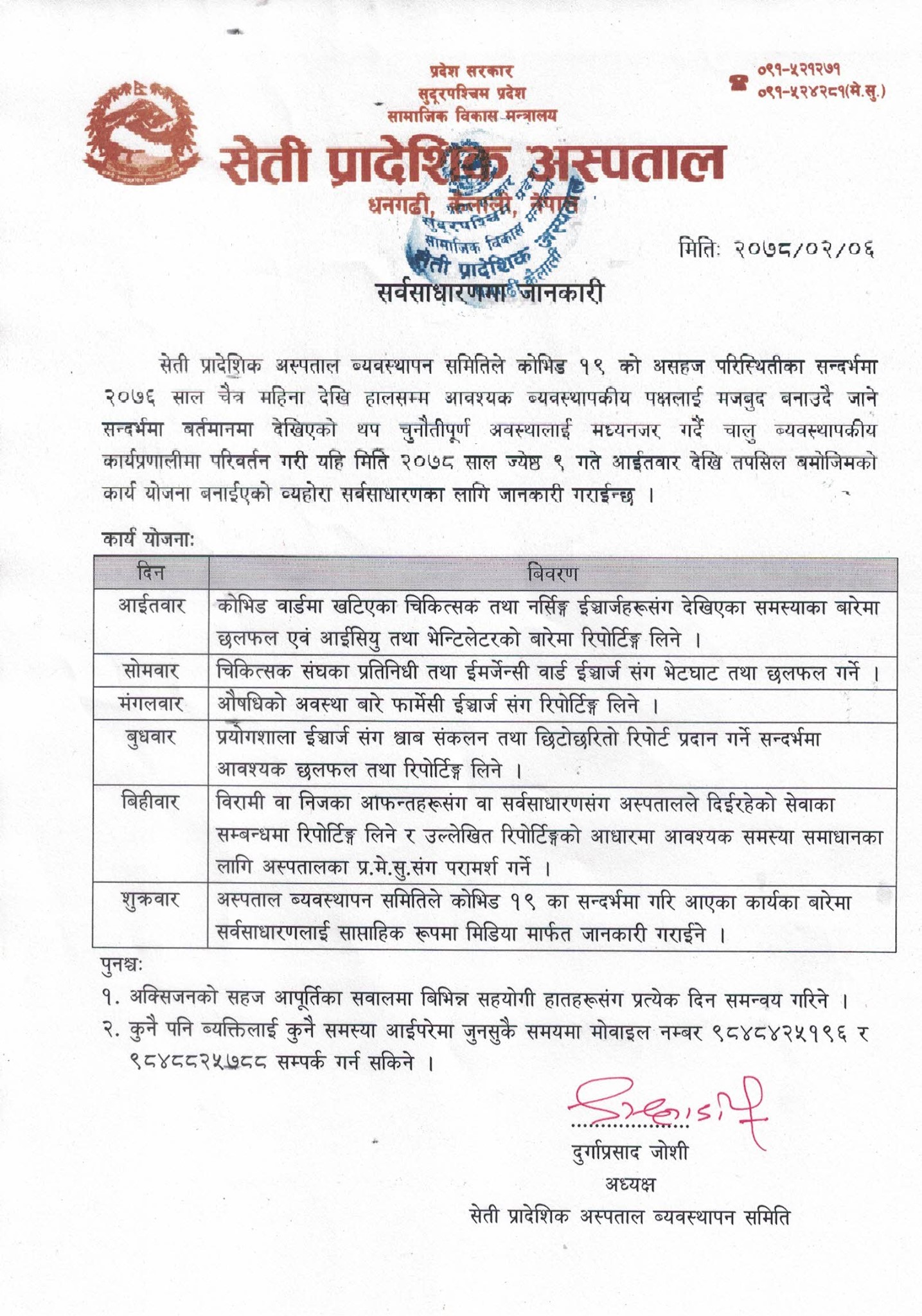 सेती प्रादेशिक अस्पतालको सेवा थप चुस्त दुरुस्त तथा प्रभावकारी बनाउन बार अनुसारको कार्यतालीका सार्वजनिक गरिएको छ । सेती प्रादेशिक अस्पताल व्यवस्थापन समितिले बिहीवार एक विज्ञप्ती जारी गर्दै अस्पतालको सेवा थप प्रभावकारी बनाउन तथा व्यवस्थापन बलियो बनाउन बारे अनुसारको कार्यतालिका सार्वजनिक गरेको हो ।