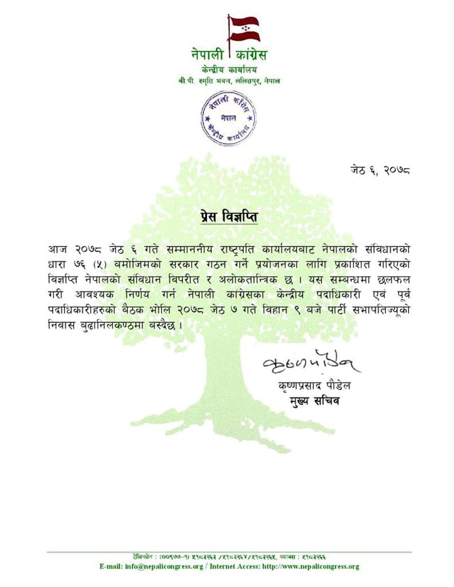 राष्ट्रपति कार्यालयबाट बिहीवार साँझ नेपालको संविधानको धारा ७६(५) बमोजिको सरकार गठन गर्ने प्रयोजनका लागि प्रकाशित विज्ञप्ति नेपालको संविधान विपरीत र अलोकतान्त्रिक भएको भन्दै कांग्रेसको सोही सम्बन्धमा छलफल गरी आवश्यक निर्णय गर्नका लागि बैठक राखेको हो ।