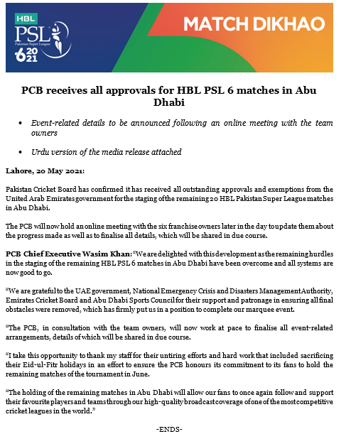 यस संस्करणको पीएसएलमा २० खेल खेल्न बाँकि छन्। फ्रेन्चाइज टिमहरुले पीसीबीलाई बाँकि रहेका खेल युएईमा आयोजना गर्न अनुरोध गरेपछि, पीसीबीले युएई सरकारको अनुमति लिएको हो।