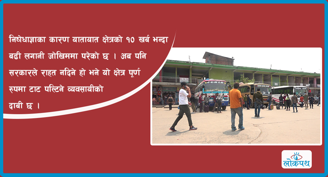 महामारीका रुपमा फैलिएको कोरोना भाइरसका कारण यातायात क्षेत्रमा भएको ठूलो लगानी जोखिममा पर्ने भएको छ । कोरोना भाइरस न्यूनीकरणका लागि सरकारले गत चैत्र ११ गतेदेखि मुलुकैभरी लकडाउन गरेको थियो । त्यसयता लामो समय सार्वजनिक यातायात पूर्ण रुपमा बन्द भए । केही समय सञ्चालन हुन थालेका सार्वजनिक यातायात कोरोनाको दोस्रो लहरका कारण निषेधाज्ञा भएपछि पुनः प्रभावित भए । जसका कारण यस क्षेत्रमा लगानी भएको खर्बौ रुपैँया जोखिममा परेको छ। सार्वजनिक यातायात क्षेत्रमा झण्डै १० खर्ब भन्दा बढीको लगानी रहेको छ । जसमा ८ खर्व रुपैँया भन्दा बढी बैंकहरुको लगानी छ । यस क्षेत्रमा १० लाख भन्दा बढी मजदुरहरुले प्रत्यक्ष रुपमा रोजगारी पाइरहेका छन् ।