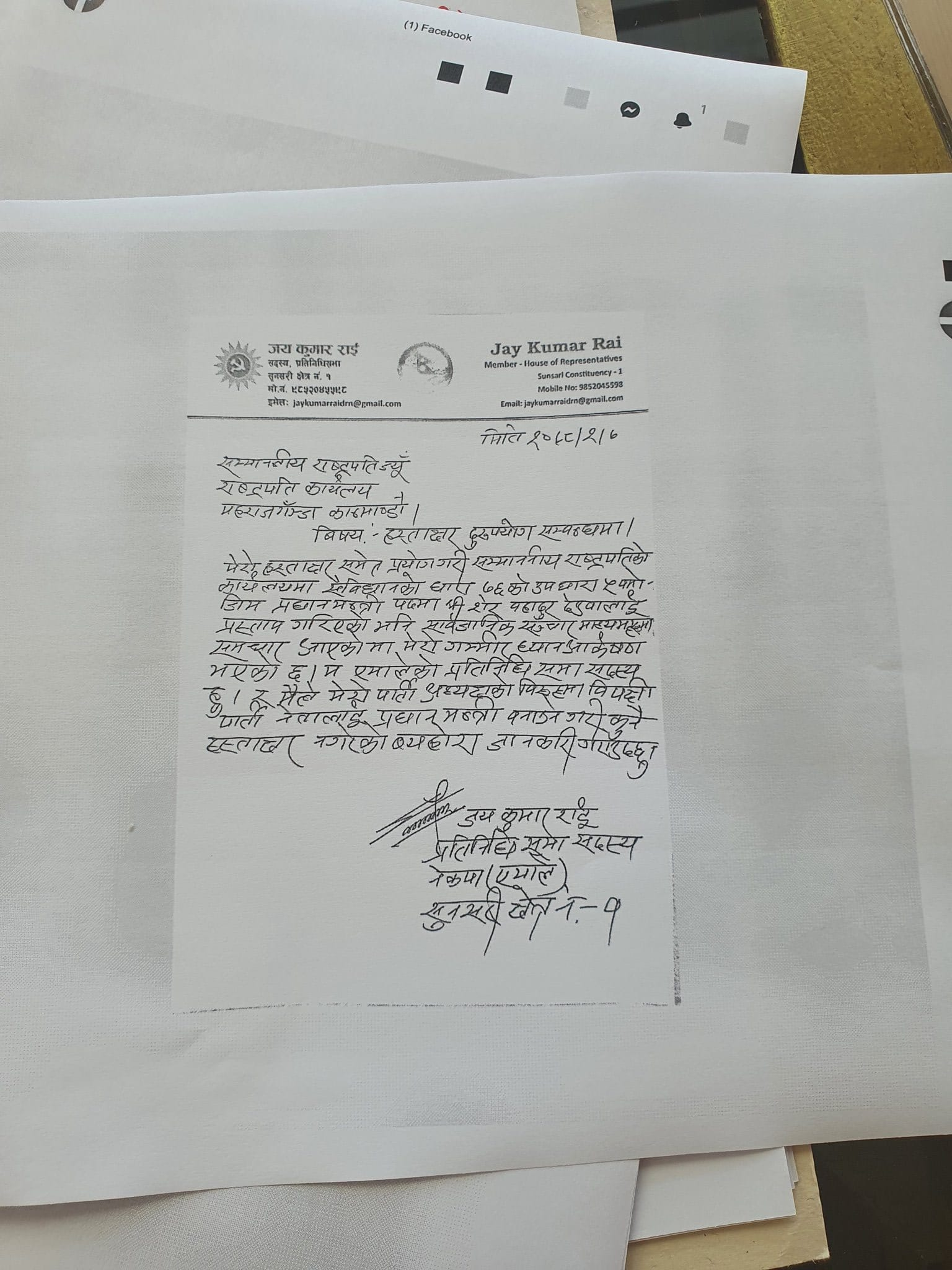 मेरो हस्ताक्षर समेत प्रयोग गरी सम्माननीय राष्ट्रपतिको कार्यालयमा संविधानको धारा ७६ को उपधारा ५ बमोजिम प्रधानमन्त्री पदमा श्री शेरबहादुर देउवालाई प्रस्ताव गरिएको भनि सार्वजनिक सञ्चार माध्यममा समाचार आएकोप्रति मेरो गम्भीर ध्यानाकर्षण भएको छ । म एमालेको प्रतिनिधि सभा सदस्य हुँ । र मैले मेरा पार्टीका अध्यक्षको विरुद्धमा विपक्षी पार्टीका नेतालाई प्रधानमन्त्री बनाउने गरी कुनै हस्ताक्षर नगरेको व्यहोरा जानकारी गराउँदछु । राईले लेखेको पत्रमा भनिएको छ ।