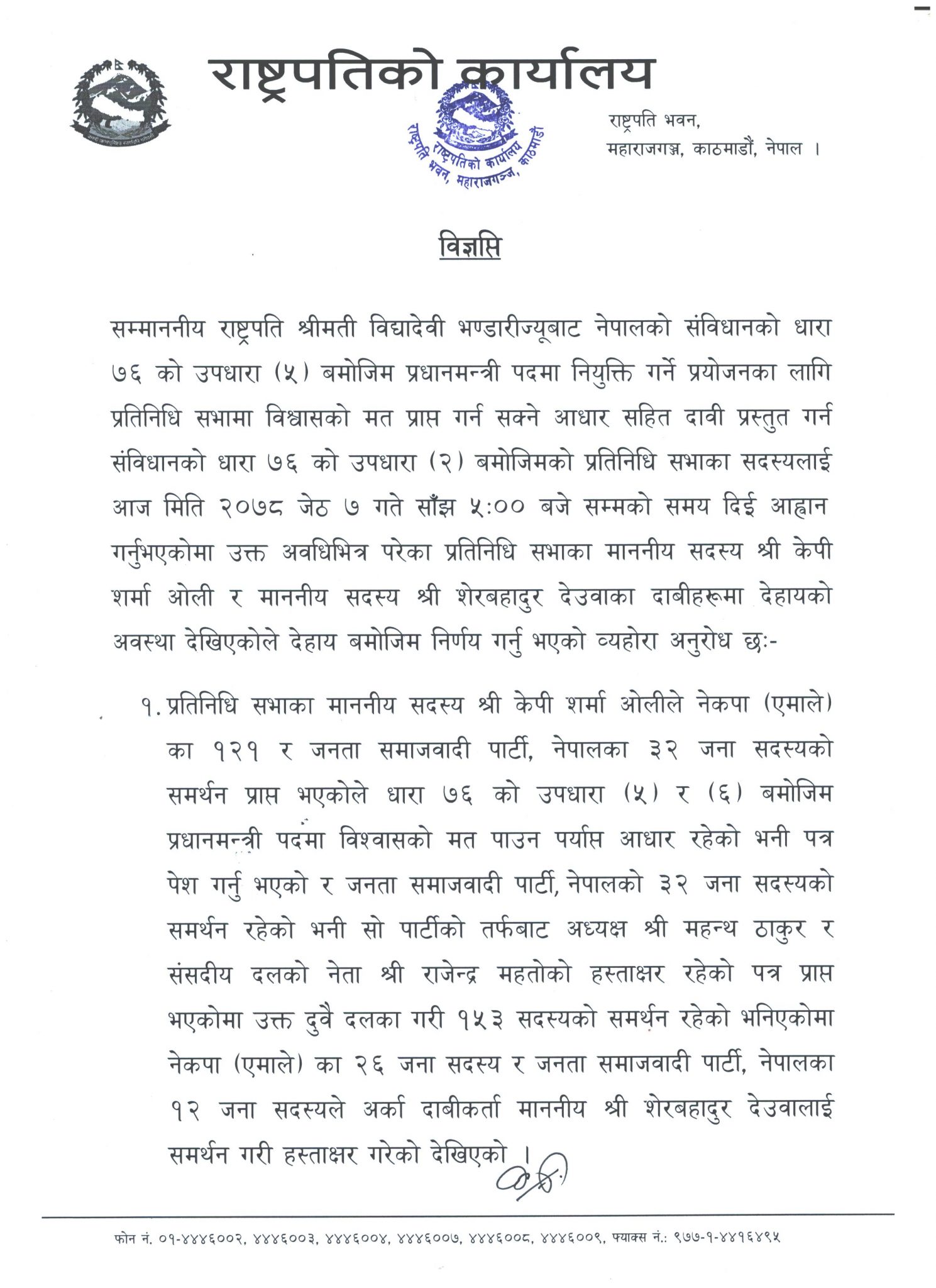 प्रधानमन्त्री ओलीले विश्वासको मत नलिइ नयाँ सरकार गठनको प्रक्रियामा जाने जेठ ६ मा निर्णय गरेलगत्तै राष्ट्रपति भण्डारीले त्यही दिन राती संविधानको धारा ७६ को उपधारा ५ अनुसार नयाँ सरकार गठनका लागि आह्वान गरिन् ।