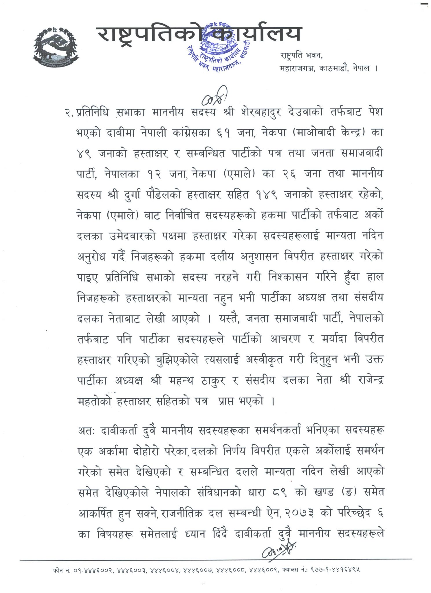 दुबै पक्षले आ–आफ्नो दाबी पेश गरेपछि राष्ट्रपतिले दुबैले दिएको आधारमाथि अध्ययन गर्न र संविधानविद्हरुसँग छलफल गर्न समय मागिन् ।